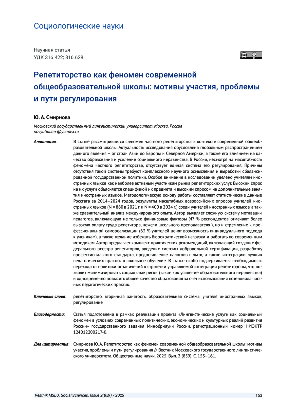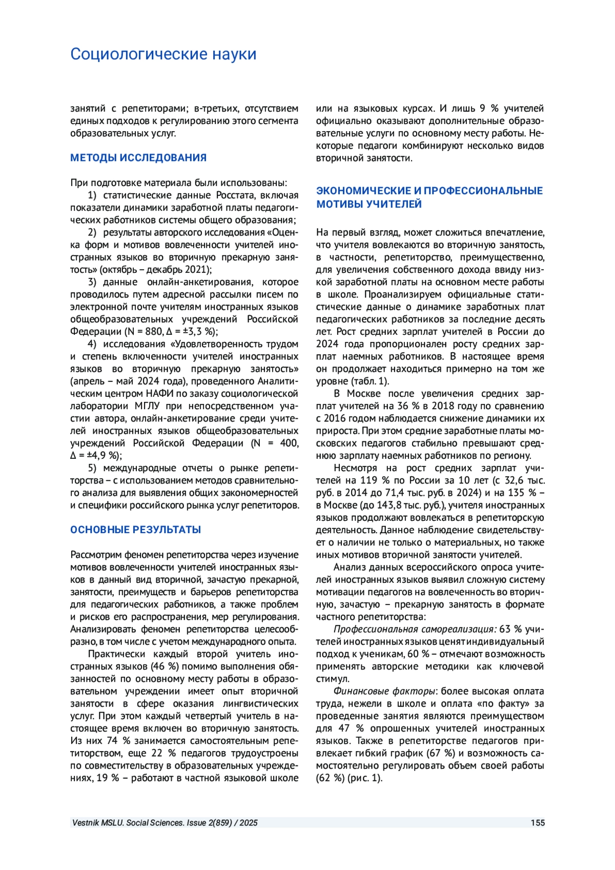 4. Смирнова Ю. А. Вторичная прекарная занятость учителей иностранных языков на российском рынке лингвистических образовательных услуг: дис.. канд. социол. наук. М., 2023. EDN: NVSUFS