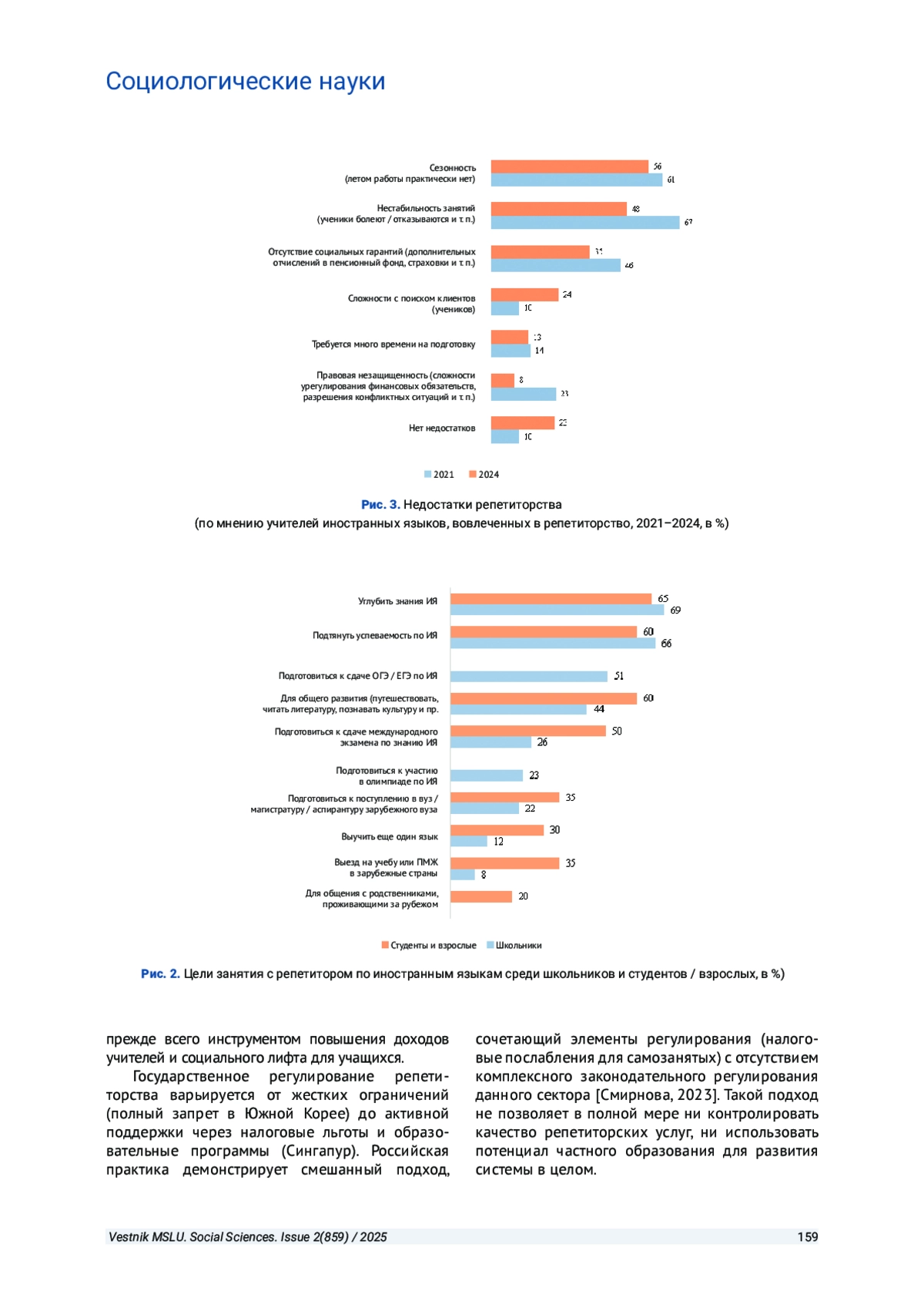 В статье рассматривается феномен частного репетиторства в контексте современной общеобразовательной школы. Актуальность исследования обусловлена глобальным распространением данного явления - от стран Азии до Европы и Северной Америки, а также его влиянием на качество образования и усиление социального неравенства. В России, несмотря на масштабность феномена частного репетиторства, отсутствует единая система его регулирования. Причины отсутствия такой системы требуют комплексного научного осмысления и выработки сбалансированной государственной политики. Особое внимание в исследовании уделено учителям иностранных языков как наиболее активным участникам рынка репетиторских услуг. Высокий спрос на их услуги объясняется спецификой их предмета и высоким спросом на дополнительные занятия иностранных языков. Методологическую основу работы составляют статистические данные Росстата за 2014-2024 годов, результаты масштабных всероссийских опросов учителей иностранных языков (N = 880 в 2021 г. и N = 400 в 2024 г.) среди учителей иностранных языков, а также сравнительный анализ международного опыта. Автор выявляет сложную систему мотивации педагогов, включающую не только финансовые факторы (47 % респондентов отмечают более высокую оплату труда репетитора, нежели школьного преподавателя ), но и стремление к профессиональной самореализации (63 % учителей ценят возможность индивидуального подхода к ученикам), а также желание избежать бюрократической нагрузки и работать по современным методикам. Автор предлагает комплекс практических рекомендаций, включающий создание федерального реестра репетиторов, введение системы добровольной сертификации, разработку профессионального стандарта, предоставление налоговых льгот, а также интеграцию лучших педагогических практик в школьное обучение. В статье особо подчеркивается необходимость перехода от политики ограничений к стратегии управляемой интеграции репетиторства, что позволит минимизировать социальные риски (такие как усиление образовательного неравенства) и одновременно повысить общее качество образования за счет использования потенциала частных педагогических практик.
