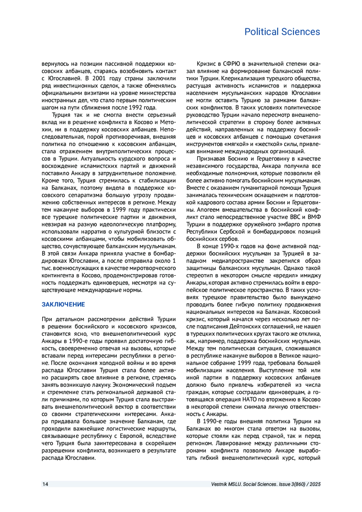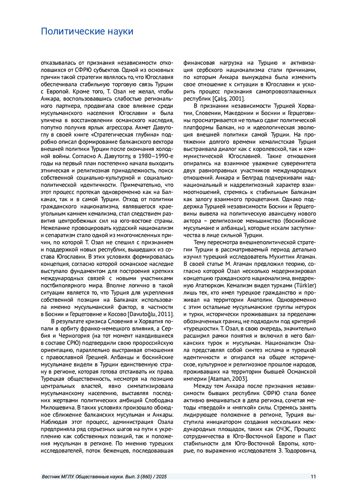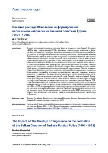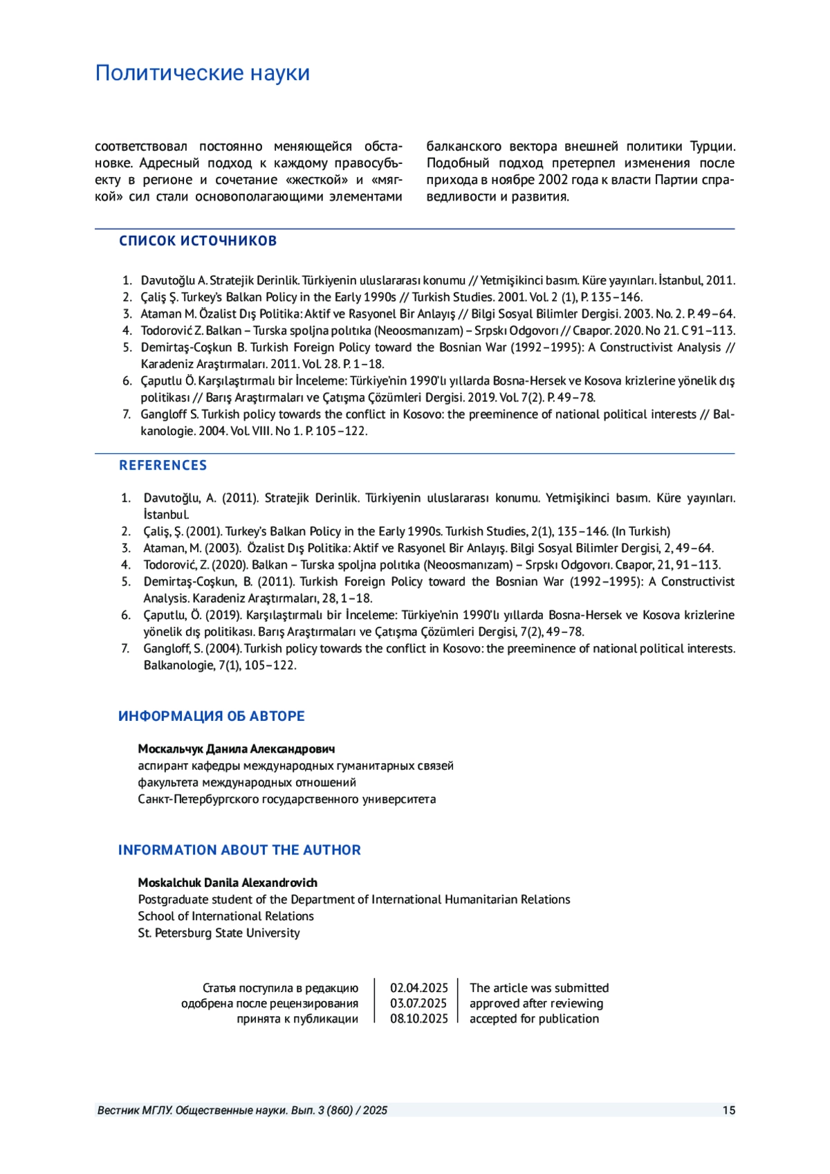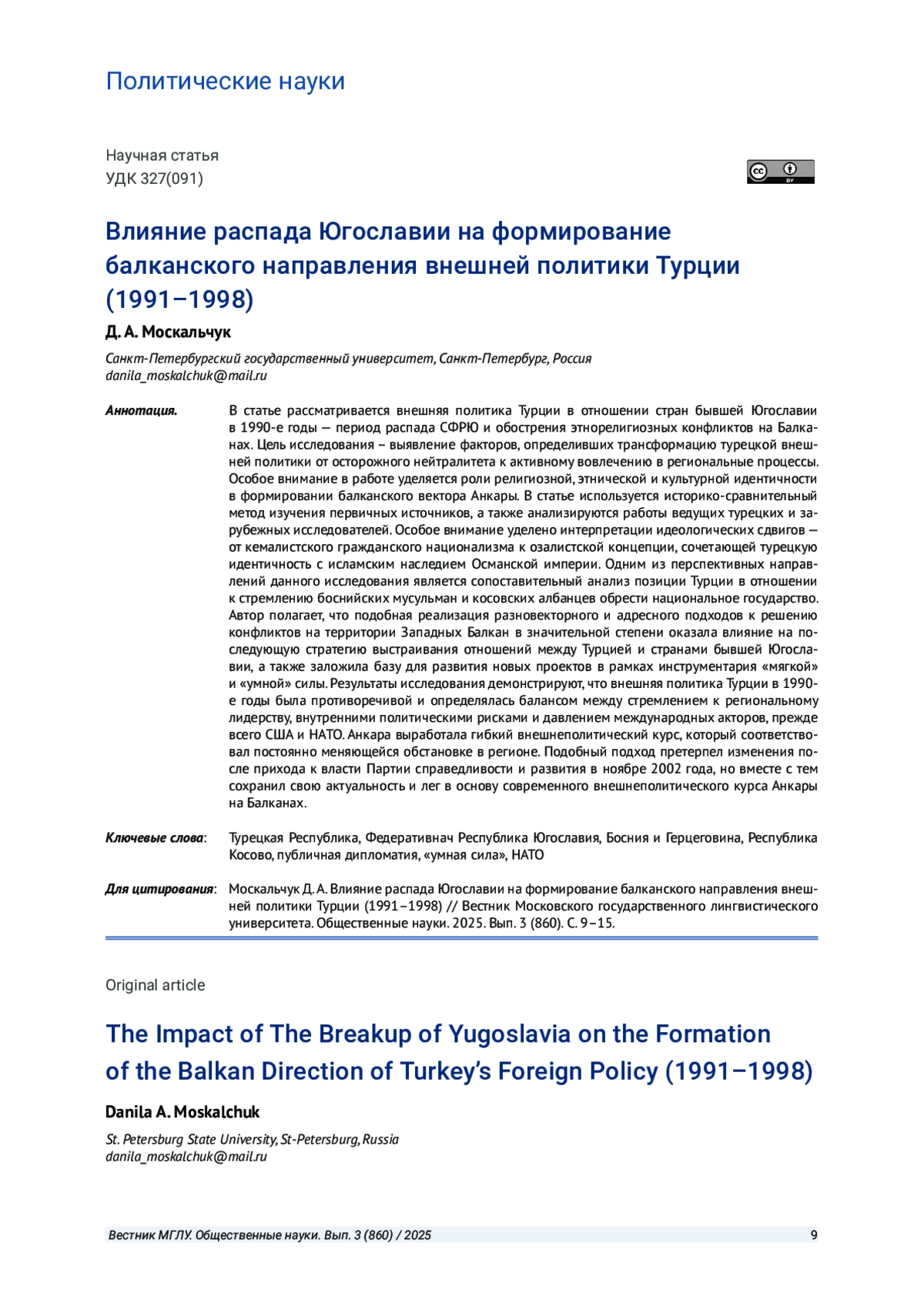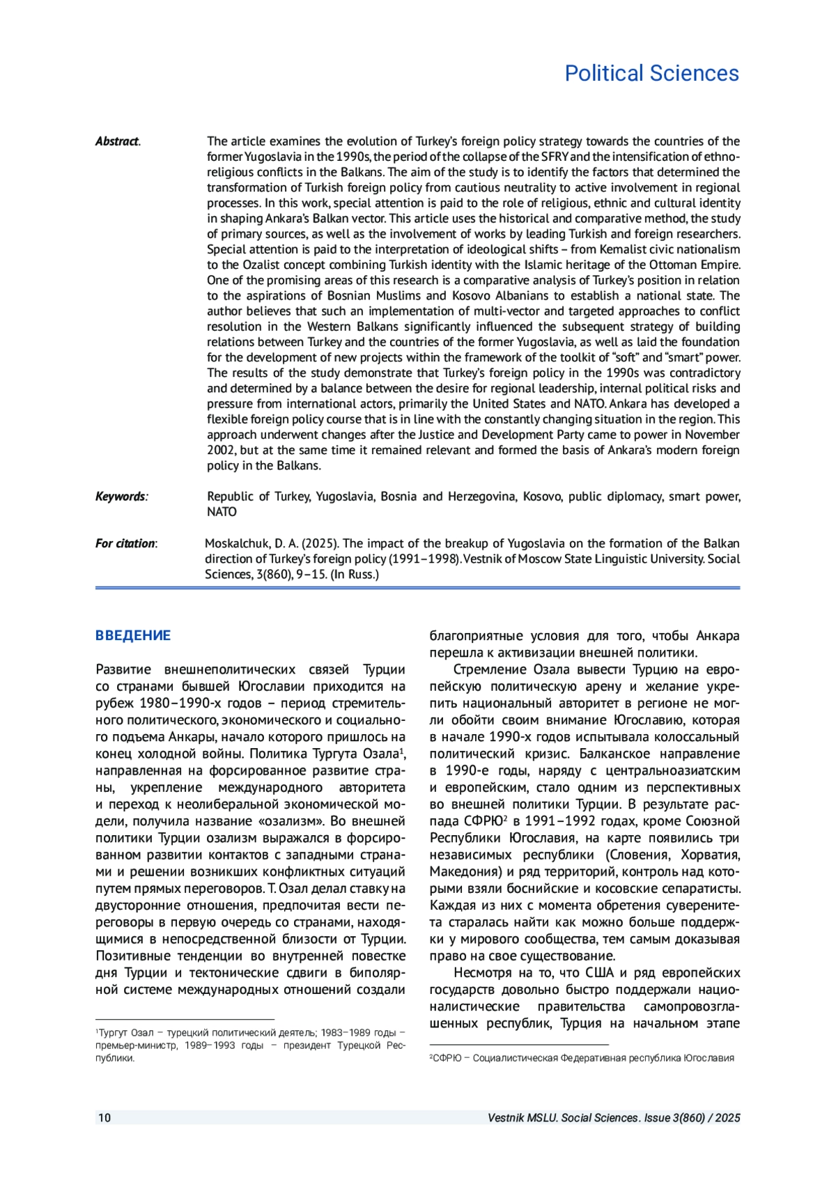 МОСКАЛЬЧУК Д. А. ВЛИЯНИЕ РАСПАДА ЮГОСЛАВИИ НА ФОРМИРОВАНИЕ БАЛКАНСКОГО НАПРАВЛЕНИЯ ВНЕШНЕЙ ПОЛИТИКИ ТУРЦИИ (1991-1998) // ВЕСТНИК МОСКОВСКОГО ГОСУДАРСТВЕННОГО ЛИНГВИСТИЧЕСКОГО УНИВЕРСИТЕТА. ОБЩЕСТВЕННЫЕ НАУКИ. 2025. № 3 (860)