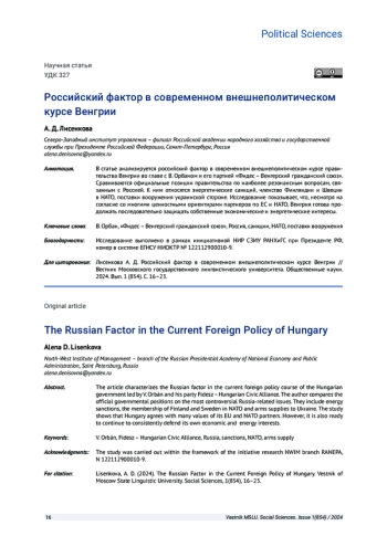 Статья: РОССИЙСКИЙ ФАКТОР В СОВРЕМЕННОМ ВНЕШНЕПОЛИТИЧЕСКОМ КУРСЕ ВЕНГРИИ (2024)