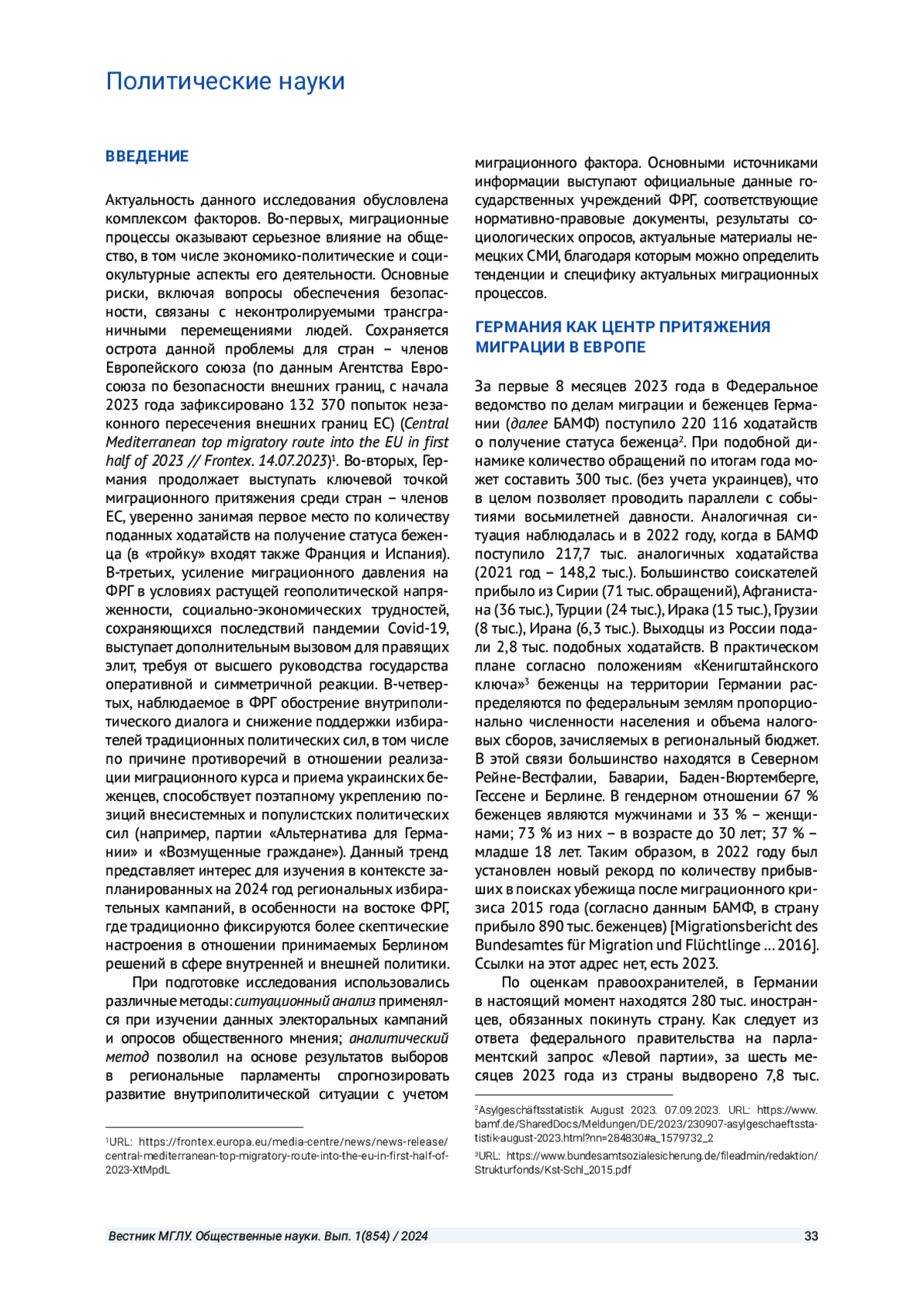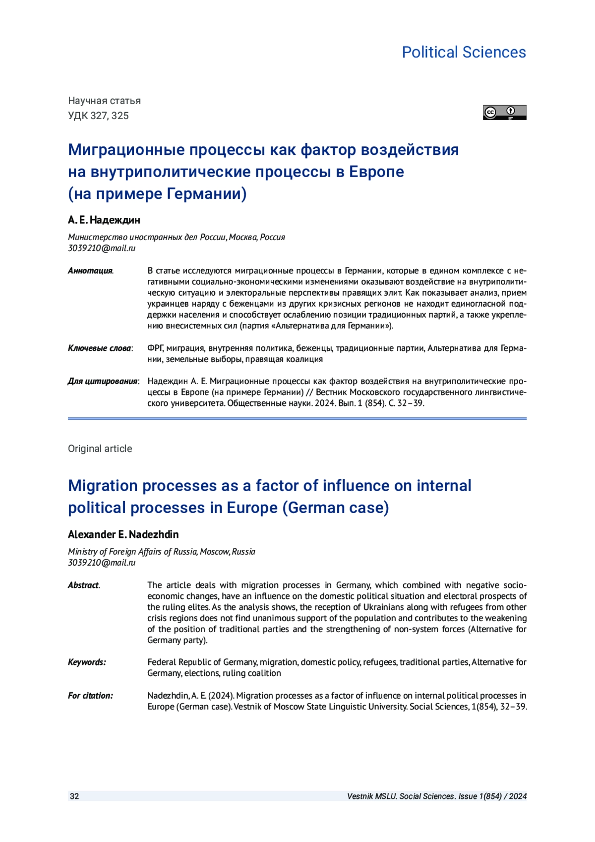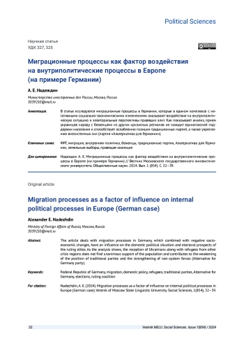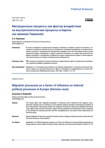 В статье исследуются миграционные процессы в Германии, которые в едином комплексе с негативными социально-экономическими изменениями оказывают воздействие на внутриполитическую ситуацию и электоральные перспективы правящих элит. Как показывает анализ, прием украинцев наряду с беженцами из других кризисных регионов не находит единогласной поддержки населения и способствует ослаблению позиции традиционных партий, а также укреплению внесистемных сил (партия «Альтернатива для Германии»).