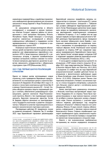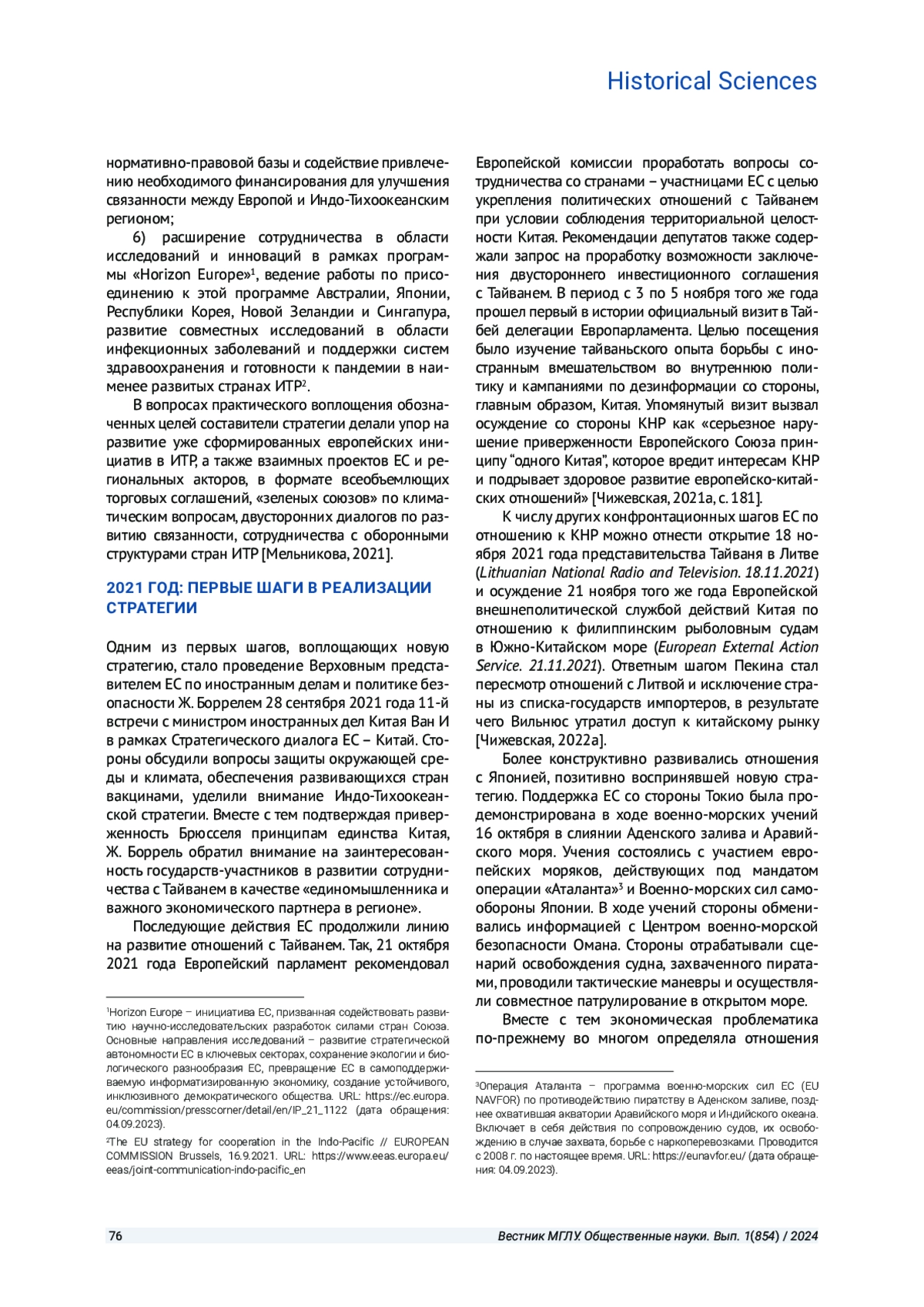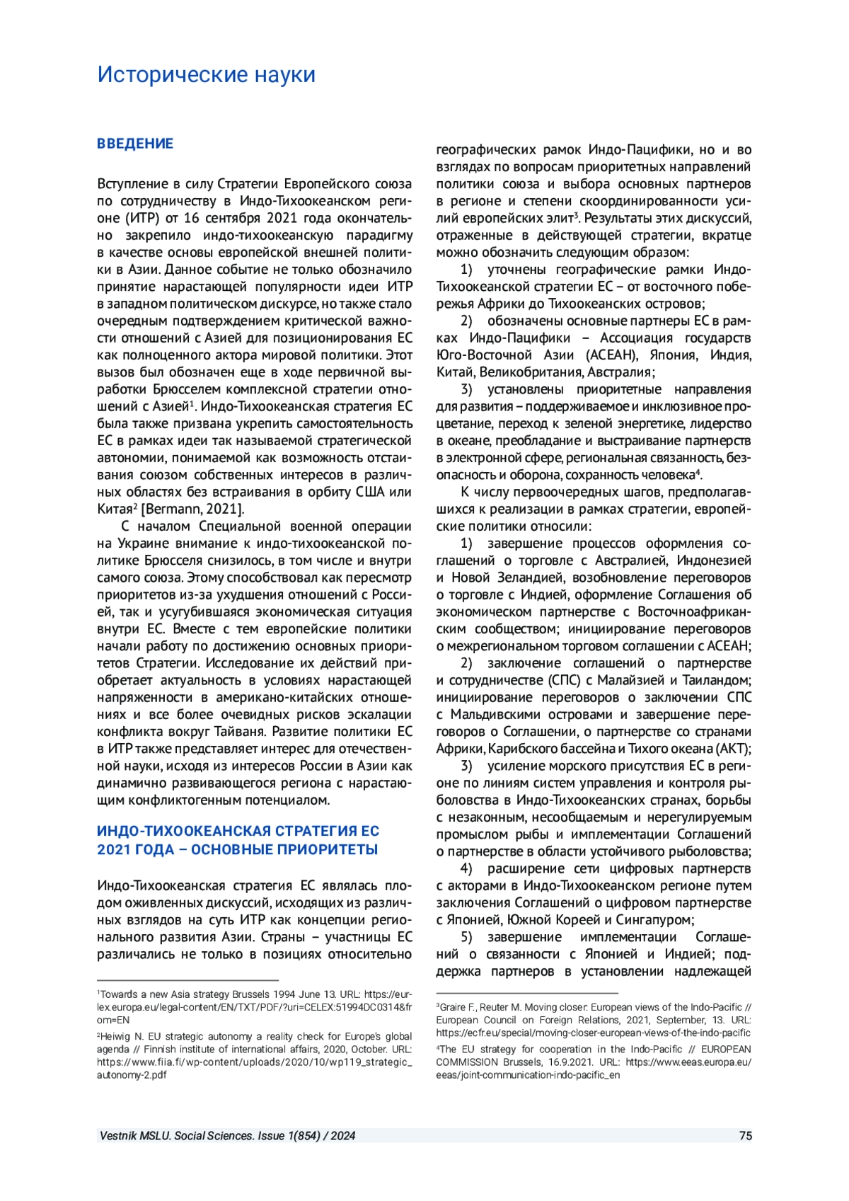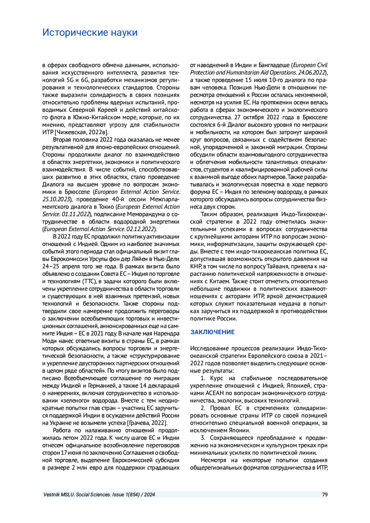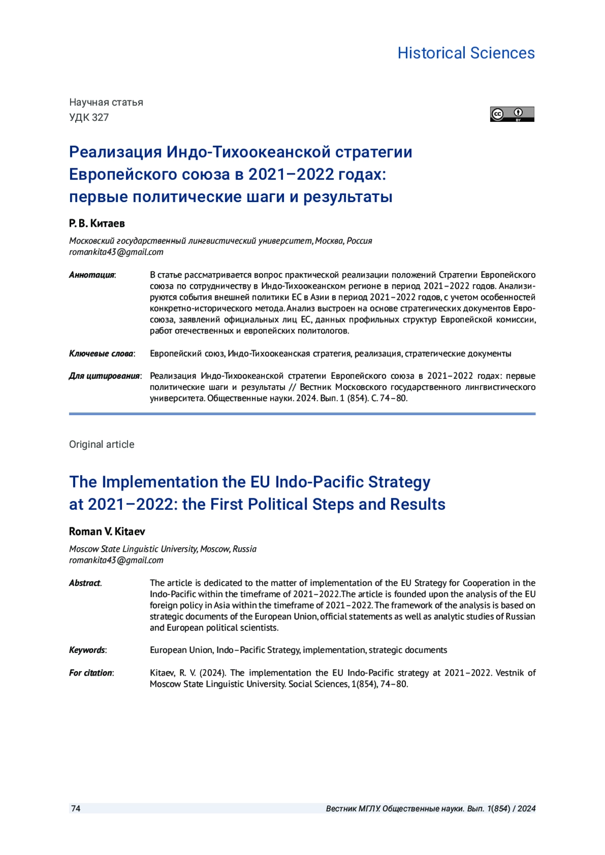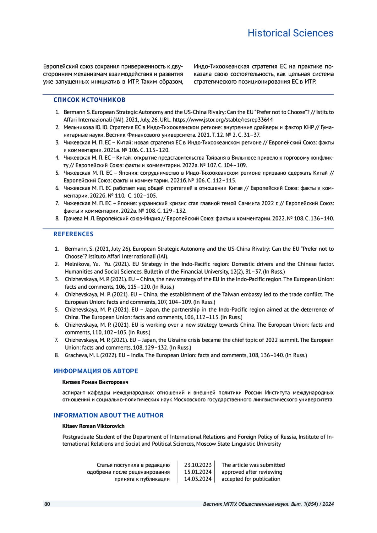 КИТАЕВ Р. В. РЕАЛИЗАЦИЯ ИНДО-ТИХООКЕАНСКОЙ СТРАТЕГИИ ЕВРОПЕЙСКОГО СОЮЗА В 2021-2022 ГОДАХ: ПЕРВЫЕ ПОЛИТИЧЕСКИЕ ШАГИ И РЕЗУЛЬТАТЫ // ВЕСТНИК МОСКОВСКОГО ГОСУДАРСТВЕННОГО ЛИНГВИСТИЧЕСКОГО УНИВЕРСИТЕТА. ОБЩЕСТВЕННЫЕ НАУКИ. 2024. № 1 (854)