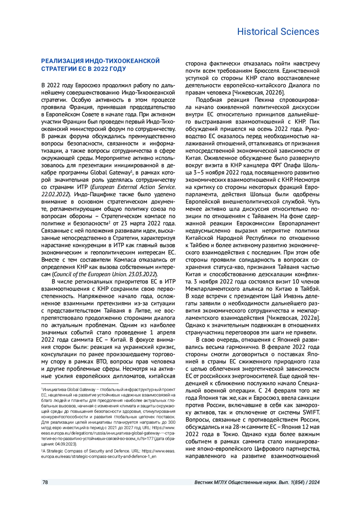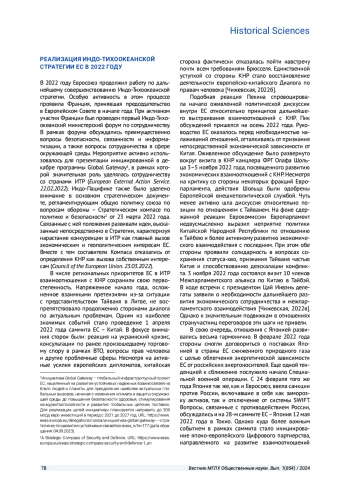 Статья: РЕАЛИЗАЦИЯ ИНДО-ТИХООКЕАНСКОЙ СТРАТЕГИИ ЕВРОПЕЙСКОГО СОЮЗА В 2021-2022 ГОДАХ: ПЕРВЫЕ ПОЛИТИЧЕСКИЕ ШАГИ И РЕЗУЛЬТАТЫ (2024)