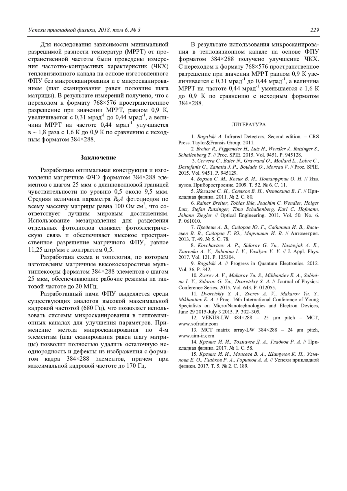 Разработана конструкция и изготовлены матричные ФЧЭ форматом 384288 элементов с шагом 25 мкм с длинноволновой границей чувствительности по уровню 0,5 около 9,5 мкм. Средняя величина R0А фотодиодов по всему массиву матрицы равна 100 Ом см2. Разработаны схема и топология, по которым изготовлены матричные высокоскоростные мультиплексоры форматом 384288 элементов с шагом 25 мкм, обеспечивающие рабочие режимы на тактовой частоте до 20 МГц. Методом гибридной сборки на индиевых столбах изготовлено матричное ФПУ форматом 384288 элементов с шагом 25 мкм с параметрами: средняя величина NETD < 30 мК, количество работоспособных элементов > 97 %. Использование мезатравления для разделения отдельных фотодиодов снижает фотоэлектрическую связь и обеспечивает высокое пространственное разрешение матричного ФПУ, равное 11,25 штр/мм. Представлены примеры использования системы микросканирования для снижения дефектных пикселов в кадре изображения и/или увеличения формата кадров до 768576. Показано, что в результате использования микросканирования в тепловизионном канале на основе разработанного ФПУ при переходе к формату 768576 получено улучшение пространственного разрешения в 1,4 раза при одинаковой величине минимально разрешаемой разности температур (МРРТ), а МРРТ на частоте 0,44 мрад-1 уменьшается с 1,6 К до 0,9 К по сравнению с исходным форматом 384×288.