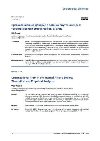 В статье анализируется теоретический и эмпирический концепт «организационного доверия» в контексте полицейских организаций, позволяющий выделить его структуру и оценить уровень. Используются общенаучные методы (анализ, синтез) и частно научный метод (социологический опрос в форме анкетирования). Результаты эмпирического анализа указывает на необходимость повышения доверия в полицейских организациях на трех уровнях: транзакционном, горизонтальном и вертикальном.