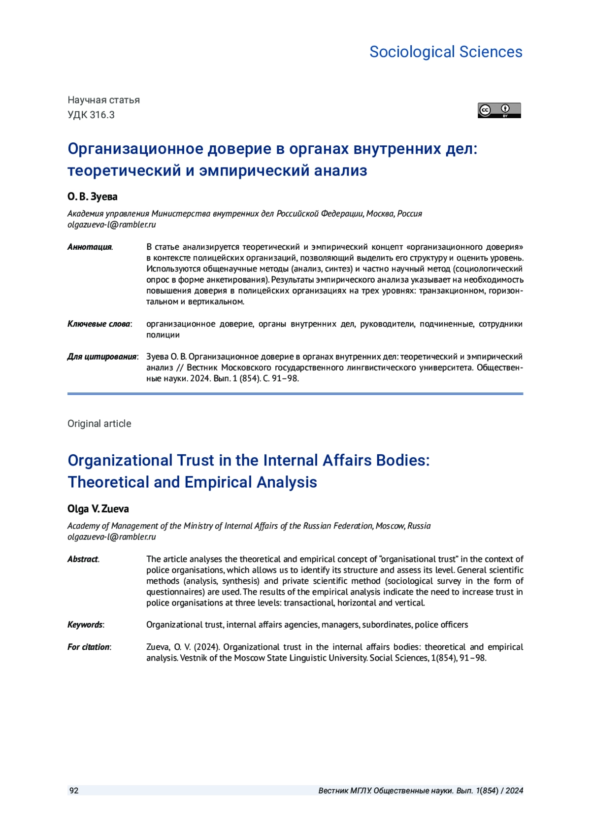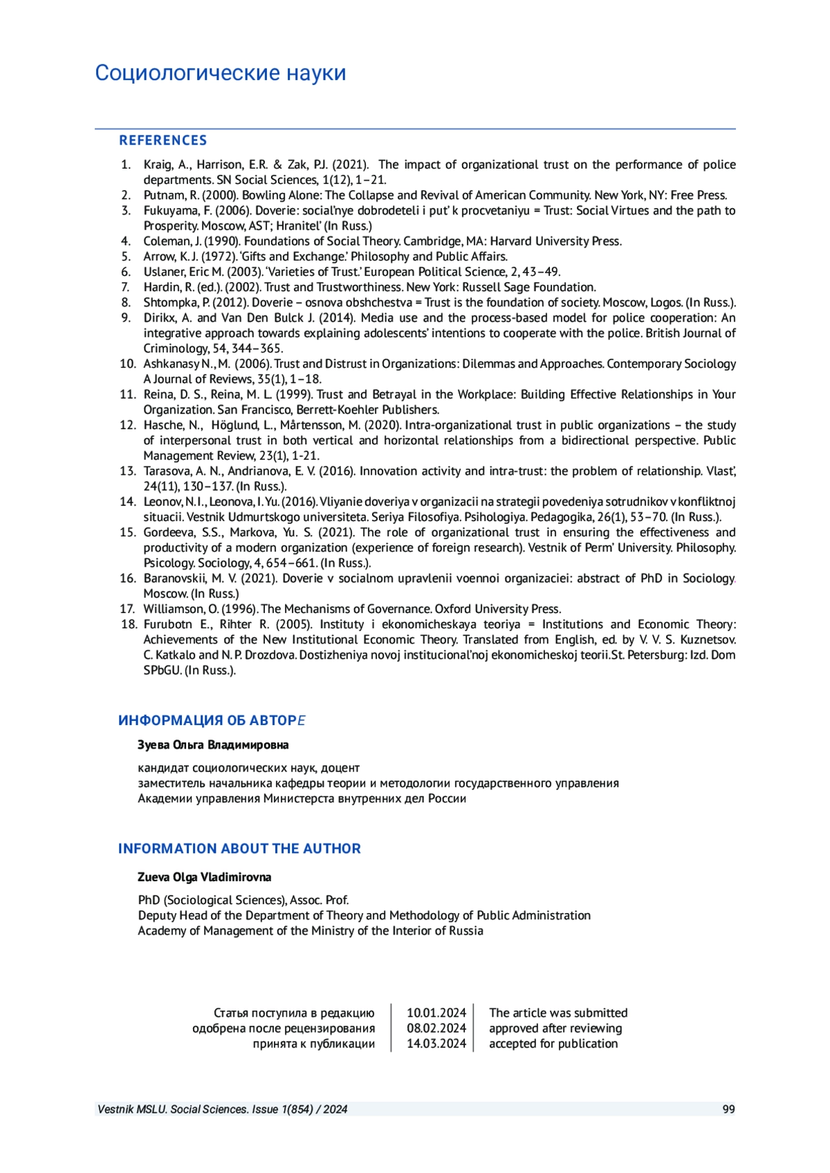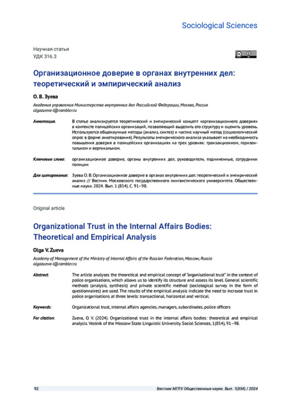1. Kraig, A., Harrison, E. R., Zak, P. J. The impact of organizational trust on the performance of police departments // SN Social Sciences. 2021. # 1(12). P. 1-21. EDN: KXUDVZ
