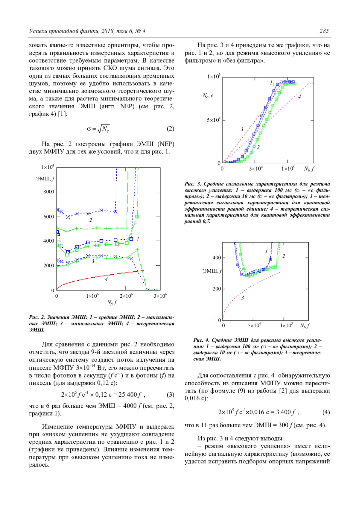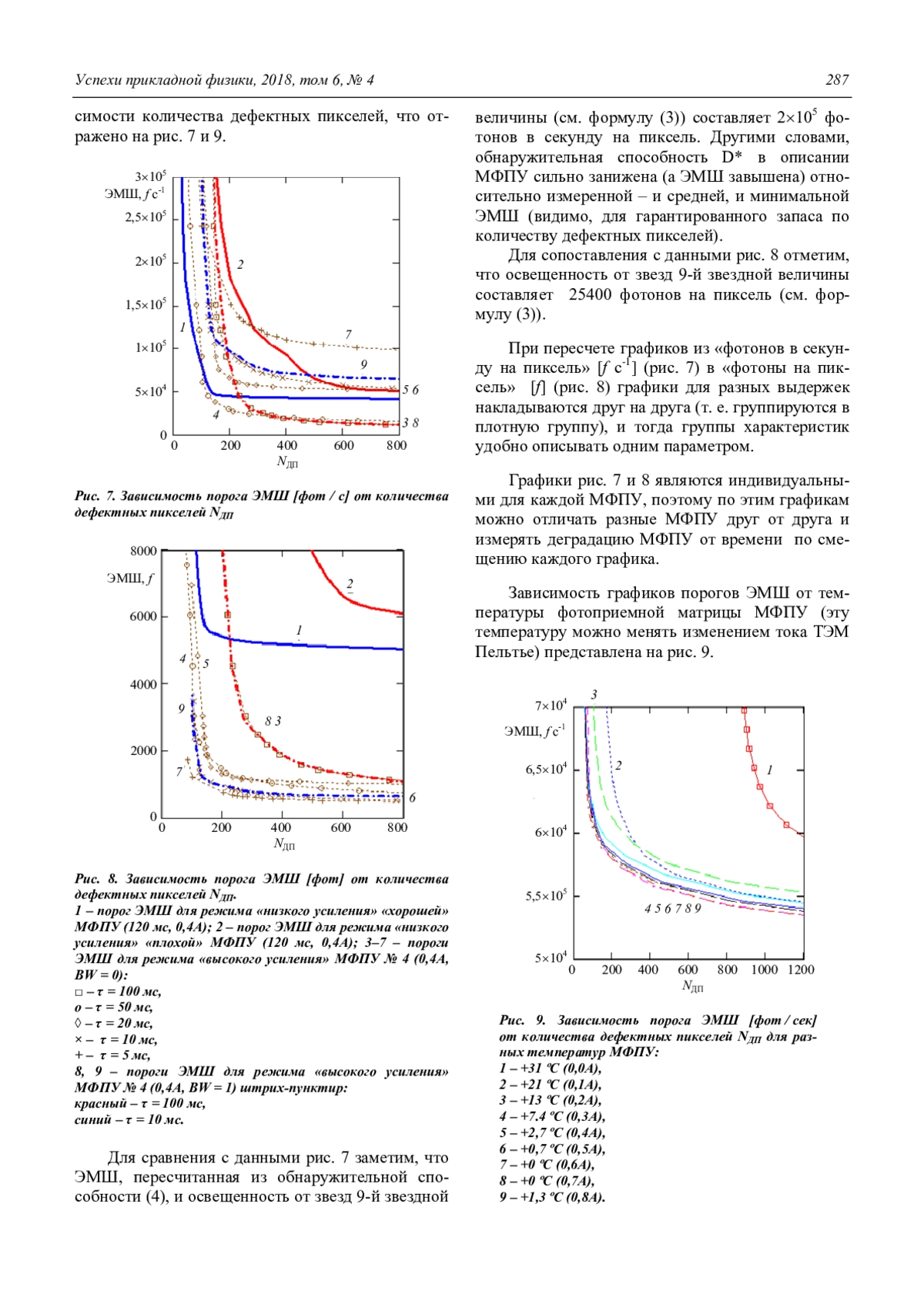 Проведены сравнительные измерения нескольких однотипных матричных фотоприемных устройств (МФПУ) SWIR-диапазона при различных режимах работы для определения характеристик и их разброса (сигнальные и шумовые характеристики, эквивалентная мощность шума, количество дефектных пикселей) и для выбора режима работы МФПУ в камере. Необходимые для этого данные в описаниях на МФПУ не приводятся. Выявлено хорошее совпадение средних характеристик всех МФПУ и значительный разброс пороговой эквивалентной мощности шума от количества дефектных пикселей для разных МФПУ. Рассмотрены преимущества и недостатки режимов: «низкого» и «высокого усиления», «с фильтром» и «без фильтра», при разной температуре МФПУ (изменяемой током термоэлектрического модуля Пельтье). Выявлено отсутствие зависимости шумовых характеристик от температуры МФПУ, измерены зависимости количества дефектных пикселей и темновых токов от температуры МФПУ. Предложено информативное, но лаконичное представление параметров МФПУ и камер при выборе МФПУ (или камер) для разрабатываемой системы при оценке качества конкретной МФПУ (или камеры) для комплектации изделий.