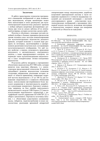В работе представлена технология программного совмещения изображений от ряда независимых видеоканалов, которая закономерно может быть использована и легко реализуема для мультиспектральной видеосистемы реального времени с любым набором матричных фотоприёмных датчиков, при этом не сильно заботясь об их оптической юстировке, которую достаточно сделать грубо.
