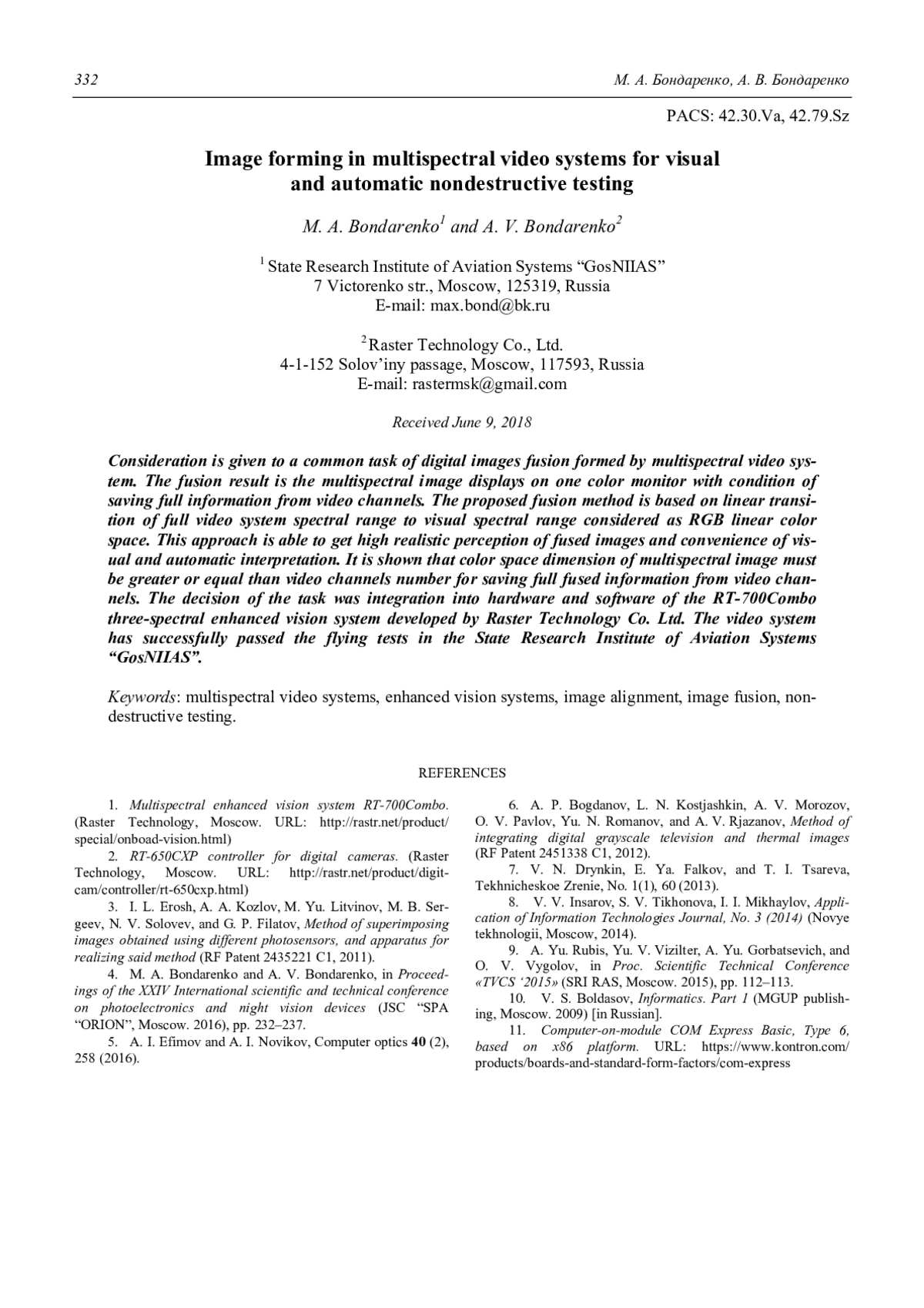 3. I. L. Erosh, A. A. Kozlov, M. Yu. Litvinov, M. B. Sergeev, N. V. Solovev, and G. P. Filatov, Method of superimposing images obtained using different photosensors, and apparatus for realizing said method (RF Patent 2435221 C1, 2011).