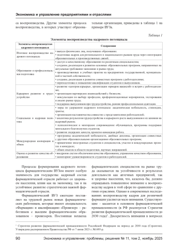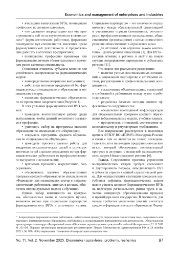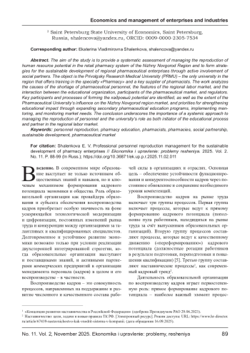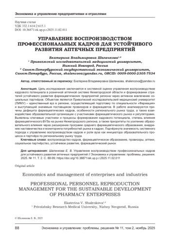 Цель исследования заключается в системной оценке управления воспроизводством кадрового потенциала в розничной аптечной системе Нижегородской области и формировании стратегий устойчивого развития фармацевтических предприятий региона через активное вовлечение социальных партнёров. Объектом является Приволжский исследовательский медицинский университет (ПИМУ) - единственный вуз в регионе, осуществляющий подготовку по специальности «Фармация» и выступающий значимым поставщиком провизоров и фармацевтов. В работе анализируются причины дефицита фармацевтических кадров, особенности регионального рынка труда, а также взаимодействие образовательной организации с участниками фармацевтического рынка и регуляторами. Выявлены ключевые участники и процессы формирования кадрового потенциала, степень влияния фармацевтического ВУЗа на рынке Нижегородского региона, а также приоритеты по усилению образовательного влияния через расширение программ среднего фармацевтического образования, внедрение наставничества и мониторинга потребностей рынка в кадрах. Подчёркнута значимость системного подхода к управлению воспроизводством кадров и роли вуза как инициатора образовательного процесса и партнёра по региональному рынку труда.