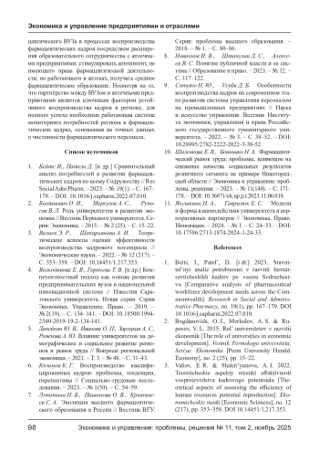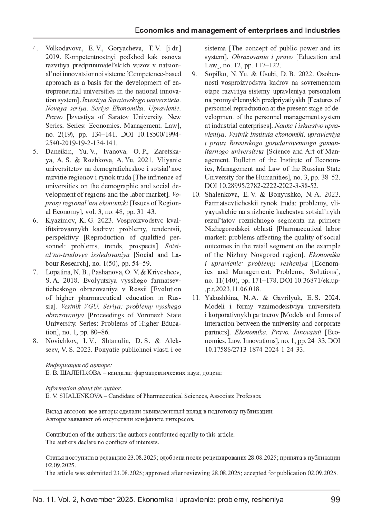 10. Шаленкова Е. В., Бонюшко Н. А. Фармацевтический рынок труда: проблемы, влияющие на снижение качества социальных результатов розничного сегмента на примере Нижегородской области // Экономика и управление: проблемы, решения. - 2023. - № 11(140). - С. 171- 178. -. DOI: 10.36871/ek.up.p.r.2023.11.06.018 EDN: YPWIEB