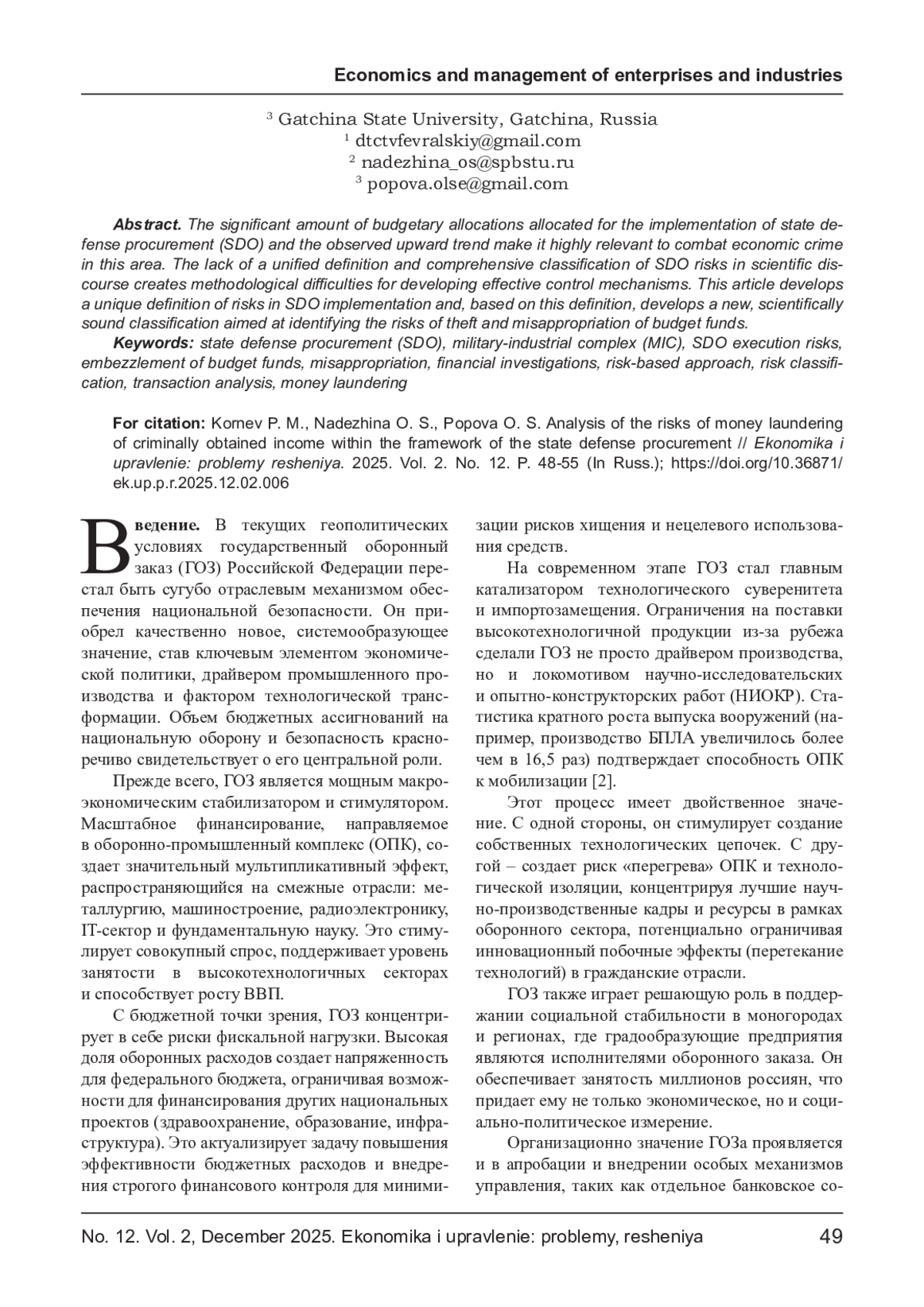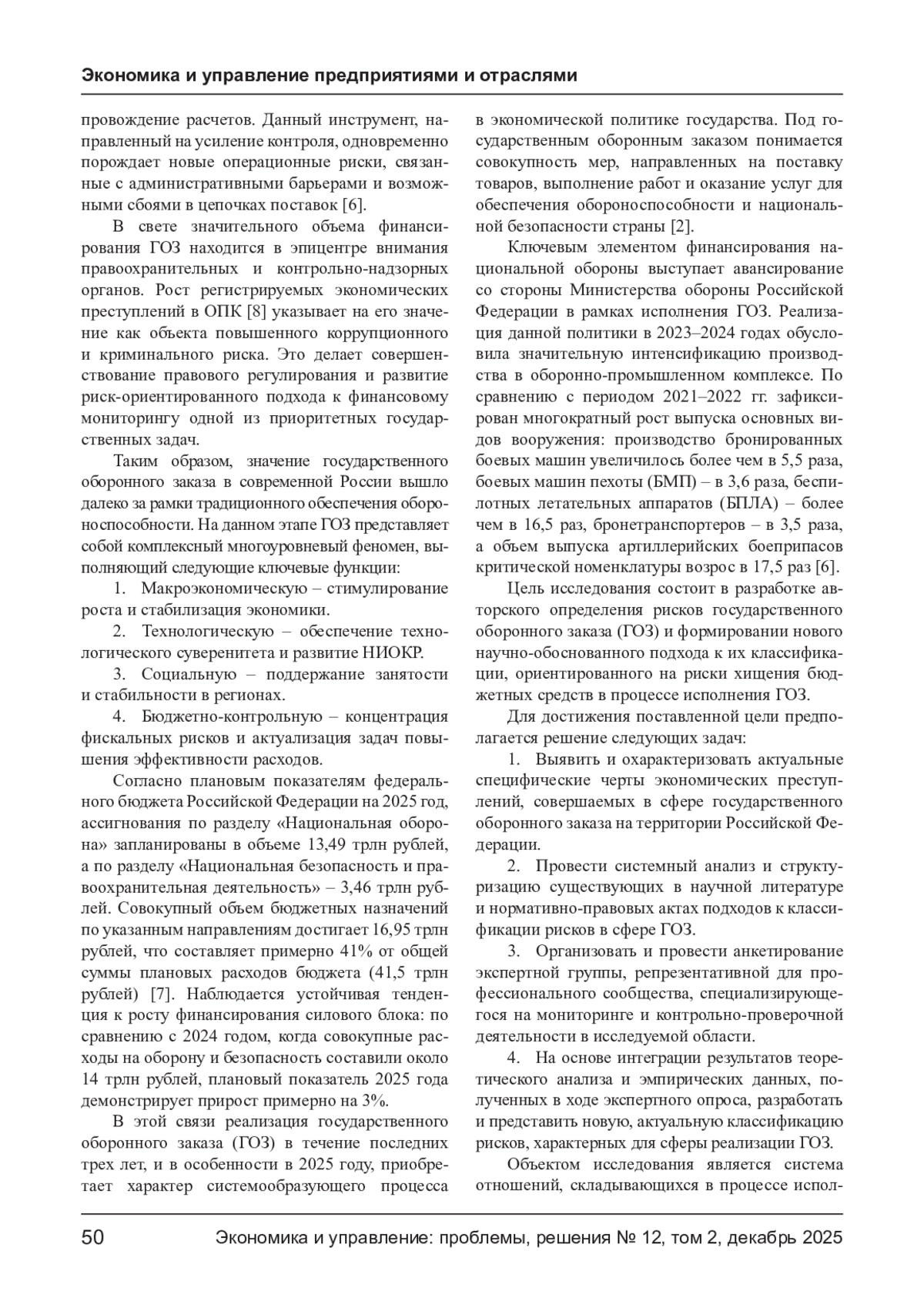 Значительный объем бюджетных ассигнований, направляемых на реализацию государственного оборонного заказа (ГОЗ), и наблюдаемая тенденция к их росту обуславливают высокую актуальность задач по противодействию экономическим преступлениям в данной сфере. Отсутствие в научном дискурсе унифицированного определения и комплексной классификации рисков ГОЗ создает методологические трудности для разработки эффективных механизмов контроля. В статье представлена разработка авторского определения рисков в сфере реализации ГОЗ и формирование на его основе новой, научно обоснованной классификации, ориентированной на выявление рисков хищения и нецелевого расходования бюджетных средств.