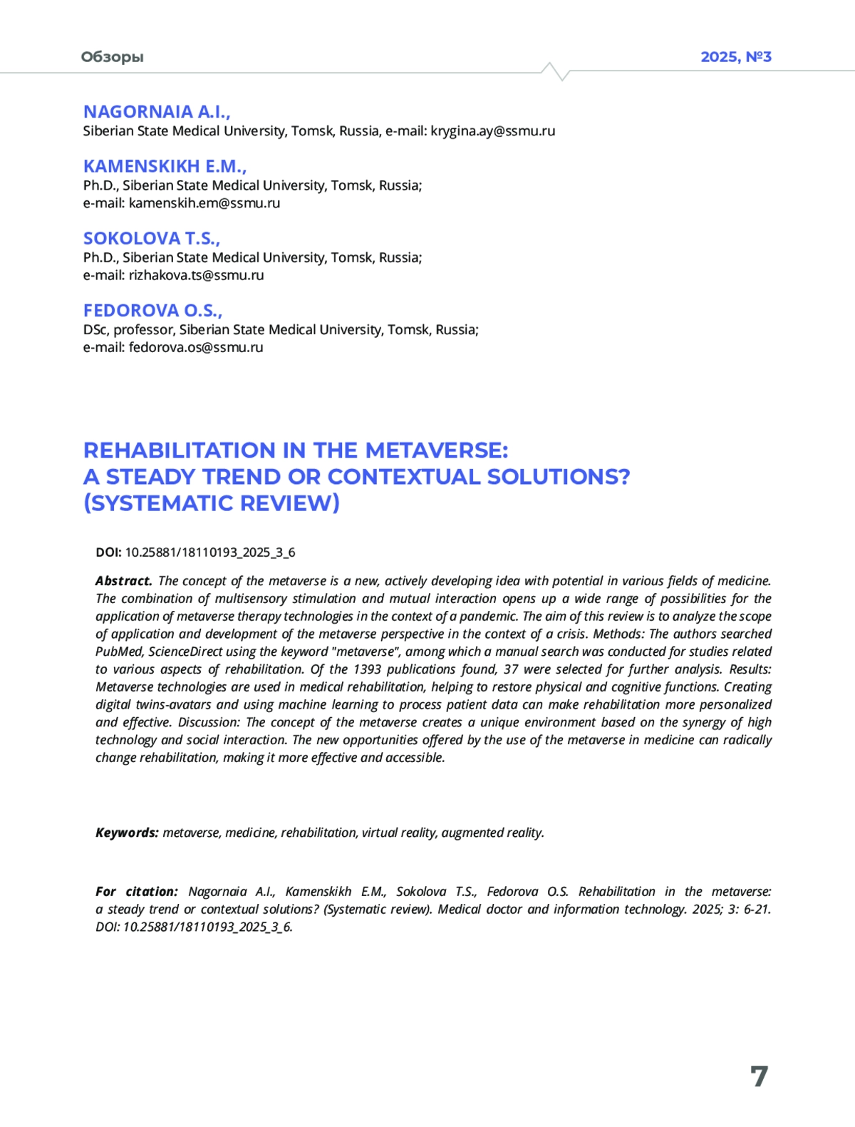 КАМЕНСКИХ Е. М., СОКОЛОВА Т. С., ФЕДОРОВА О. С., НАГОРНАЯ А. Ю. ТЕХНОЛОГИИ РЕАБИЛИТАЦИИ В МЕТАВСЕЛЕННОЙ: УСТОЙЧИВЫЙ ТРЕНД ИЛИ КОНТЕКСТНЫЕ РЕШЕНИЯ? (СИСТЕМАТИЧЕСКИЙ ОБЗОР) // ВРАЧ И ИНФОРМАЦИОННЫЕ ТЕХНОЛОГИИ. 2025. № 3