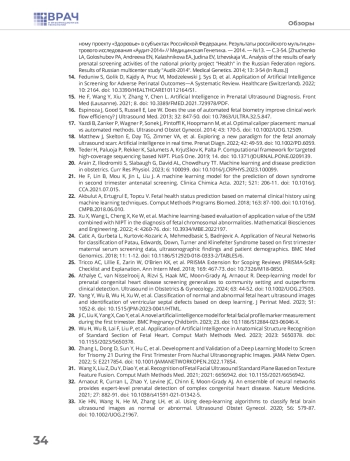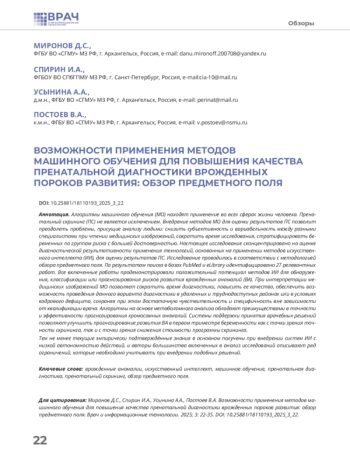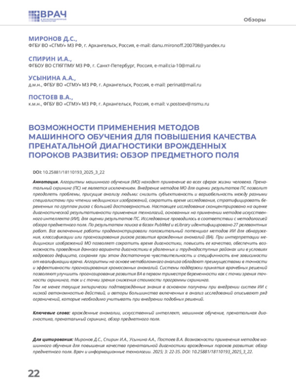 Статья: ВОЗМОЖНОСТИ ПРИМЕНЕНИЯ МЕТОДОВ МАШИННОГО ОБУЧЕНИЯ ДЛЯ ПОВЫШЕНИЯ КАЧЕСТВА ПРЕНАТАЛЬНОЙ ДИАГНОСТИКИ ВРОЖДЕННЫХ ПОРОКОВ РАЗВИТИЯ: ОБЗОР ПРЕДМЕТНОГО ПОЛЯ (2025)
