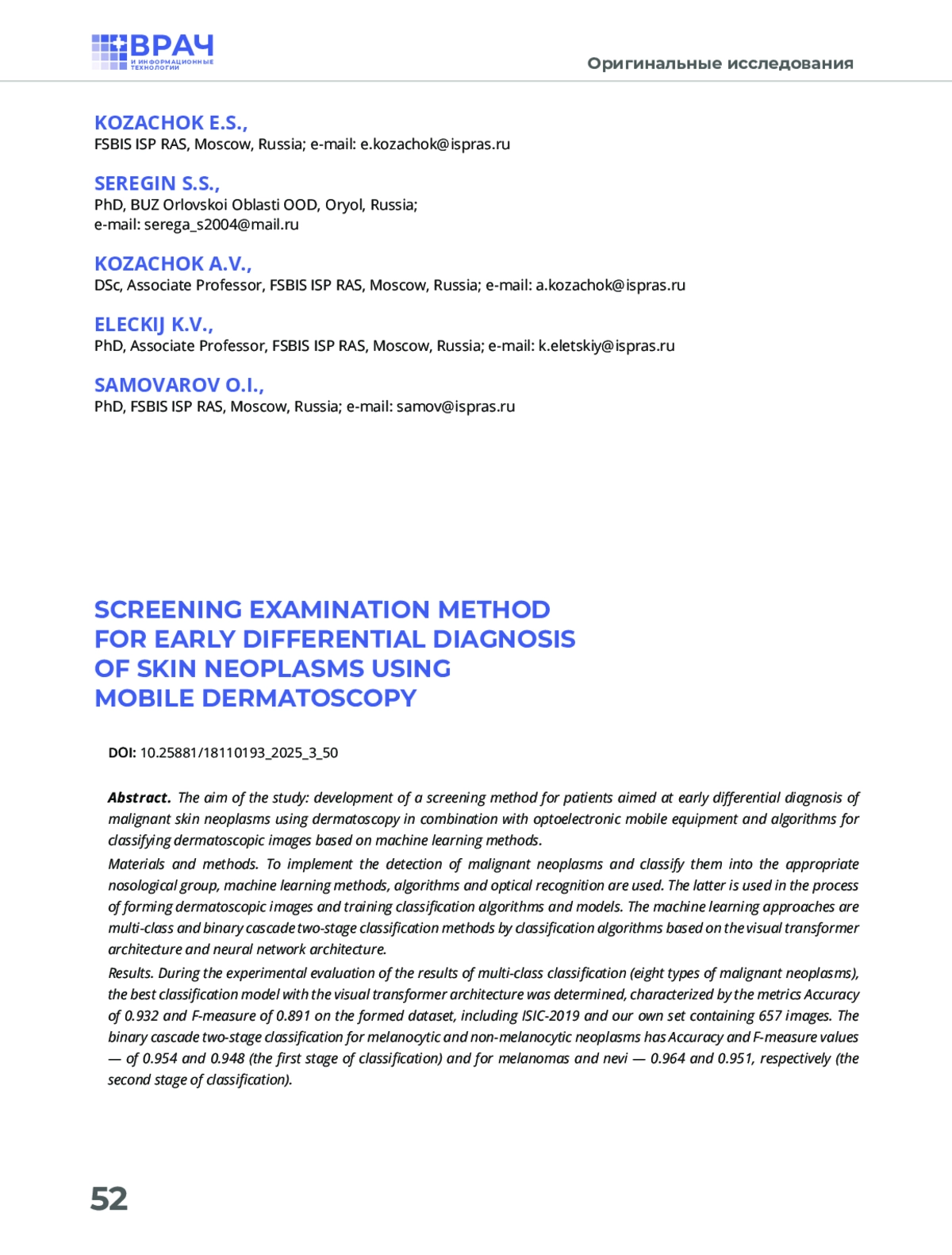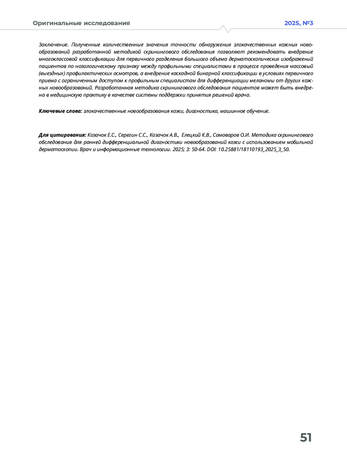 Статья: МЕТОДИКА СКРИНИНГОВОГО ОБСЛЕДОВАНИЯ ДЛЯ РАННЕЙ ДИФФЕРЕНЦИАЛЬНОЙ ДИАГНОСТИКИ НОВООБРАЗОВАНИЙ КОЖИ С ИСПОЛЬЗОВАНИЕМ МОБИЛЬНОЙ ДЕРМАТОСКОПИИ (2025)