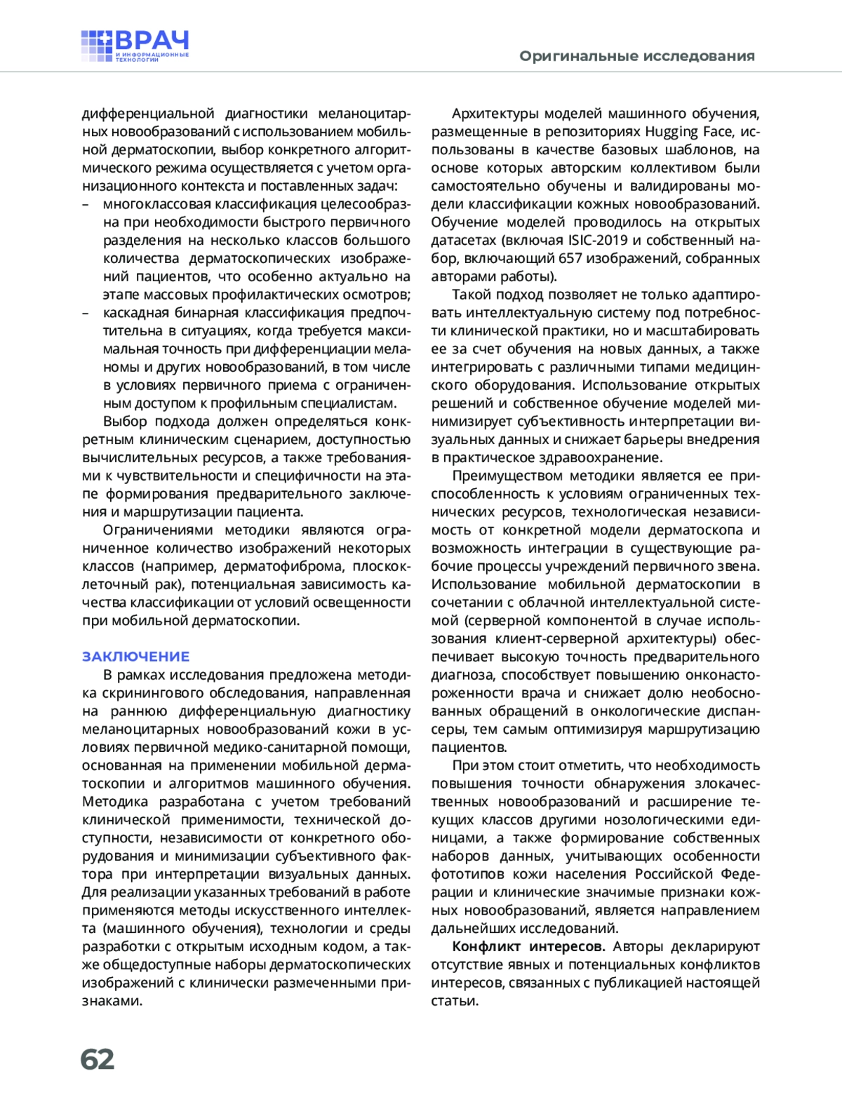 Материалы и методы. Для реализации обнаружения злокачественных новообразований и отнесения их к соответствующей нозологической группе применяются методы и алгоритмы машинного обучения и оптического распознавания. Методы оптического распознавания используются в процессе анализа дерматоскопических снимков и обучения алгоритмов и моделей классификации. В качестве применяемых подходов машинного обучения выступают методы многоклассовой и бинарной каскадной двухэтапной классификации технологии машинного обучения, основанной на нейросетевой архитектуре и архитектуре визуальных трансформеров.