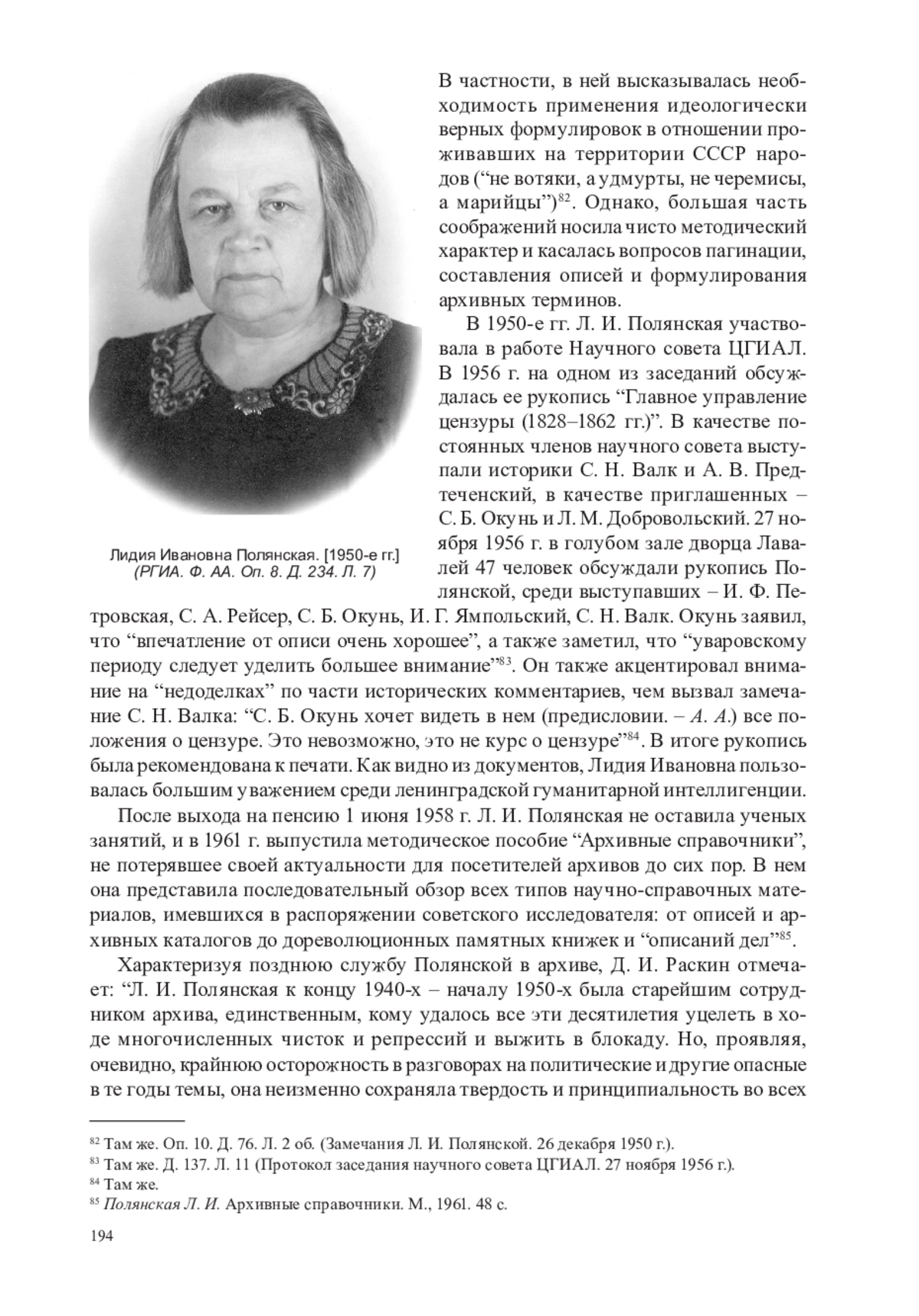 В общепризнанных положениях истории отечественного архивоведения первая половина XX в. считается самым тяжелым и противоречивым временем, когда, с одной стороны, активно формировалась государственная архивная инфраструктура со всеми ее достоинствами и недостатками, а с другой – архивное дело было “приватизировано” советскими партийными структурами с целью активной идеологической эксплуатации и практического обслуживания государственных идеалов сильных мира сего. На это непростое время пришлось профессиональное становление ленинградского архивиста и историка Лидии Ивановны Полянской (1892–1970). Автор убежден, что ее можно считать своего рода проводником, соединяющим ученые положения дореволюционной науки об архивах с тем, что сегодня называют советским архивоведением.