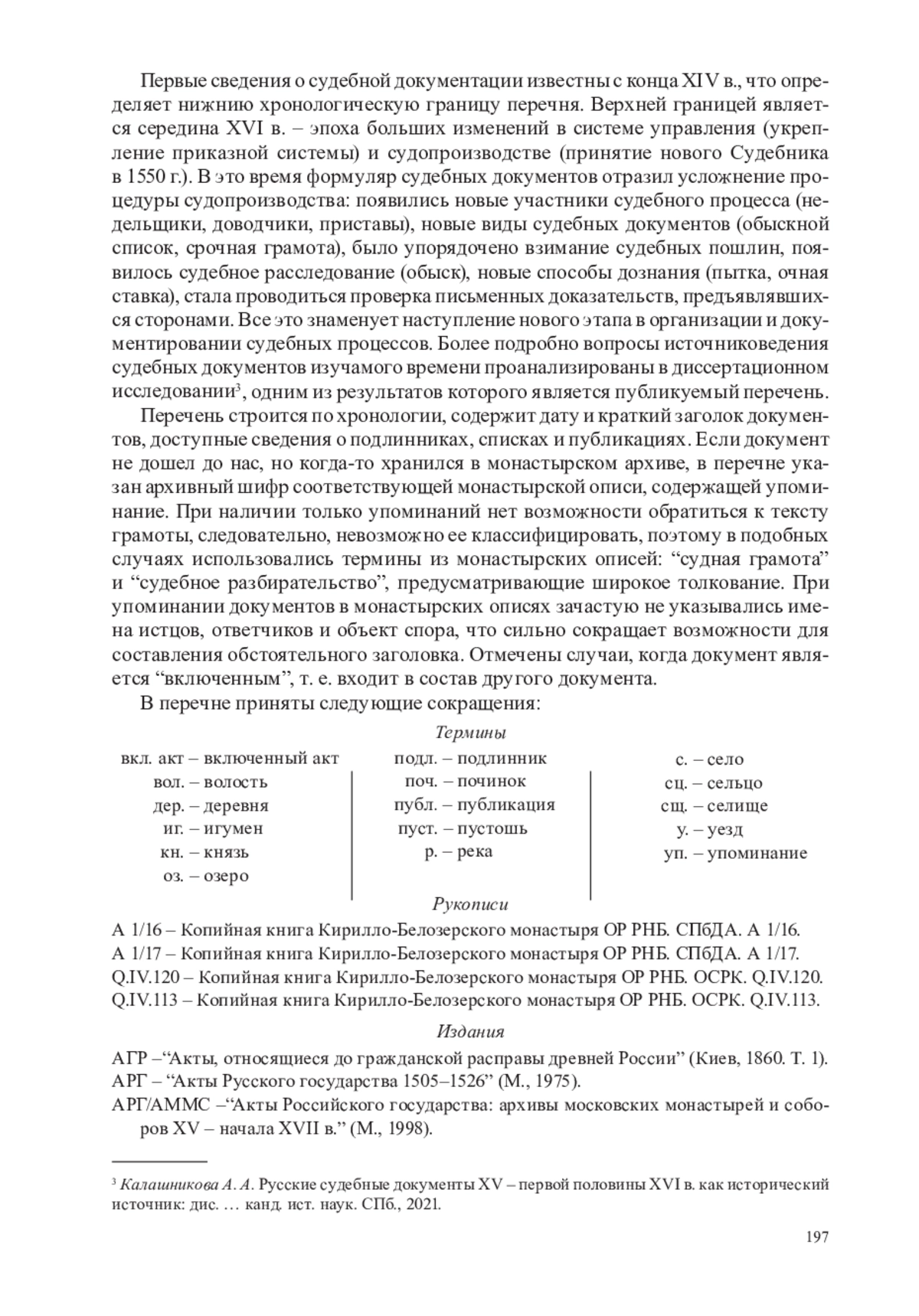 КАЛАШНИКОВА А. А. РУССКИЕ СУДЕБНЫЕ ДОКУМЕНТЫ КОНЦА XIV – ПЕРВОЙ ПОЛОВИНЫ XVI В.: ХРОНОЛОГИЧЕСКИЙ ПЕРЕЧЕНЬ1 * // АРХЕОГРАФИЧЕСКИЙ ЕЖЕГОДНИК. 2024. ТОМ 1