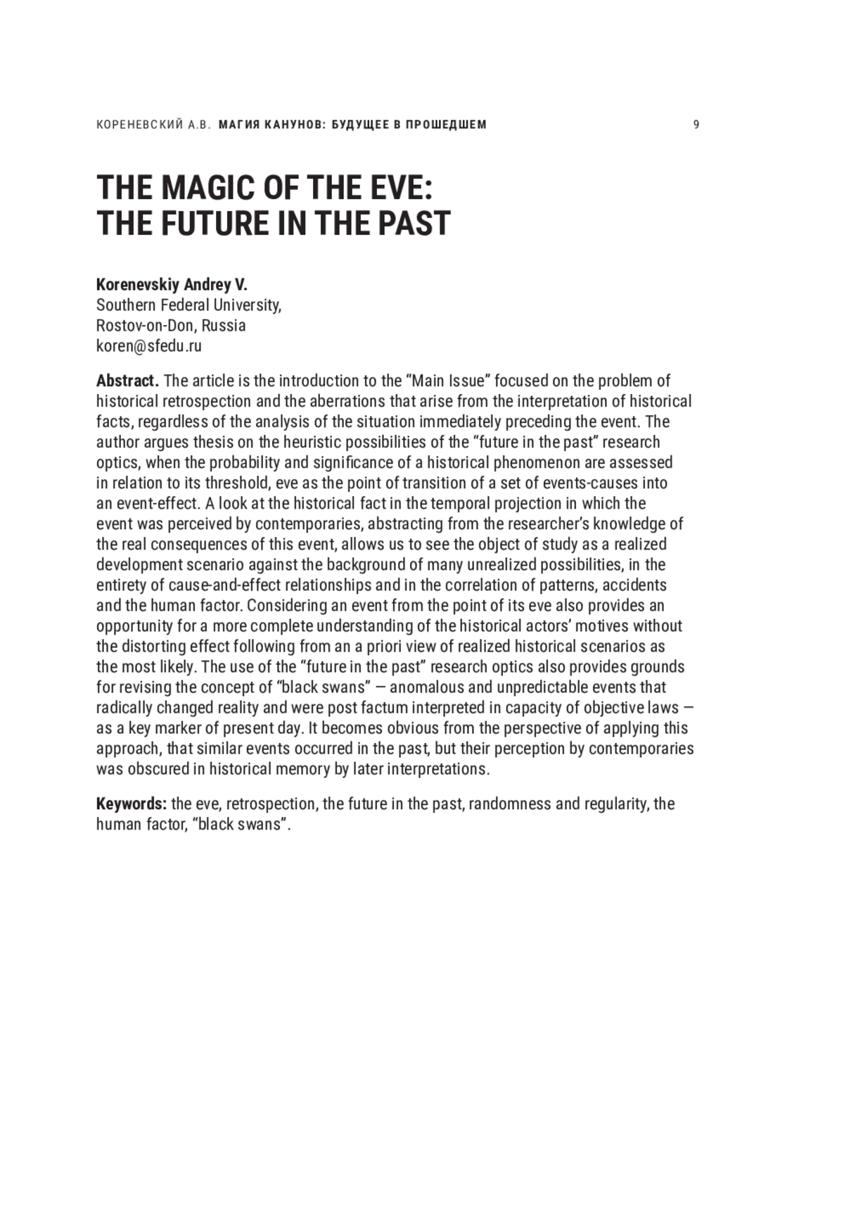 Статья представляет собой введение к теме номера, сфокусированной на проблеме исторической ретроспекции и тех аберрациях, которые порождает трактовка исторических фактов безотносительно анализа ситуации, непосредственно предшествовавшей произошедшему событию. Обосновывается тезис об эвристических возможностях исследовательской оптики «будущее в прошедшем», когда вероятность и значение исторического явления оценивается в соотнесении с его преддверием, кануном как точкой перехода совокупности событий-причин в событие-следствие. Взгляд на исторический факт в той темпоральной проекции, в которой событие воспринималось современниками, абстрагируясь от знания исследователя о реальных его последствиях, позволяет увидеть исследуемое явление как реализованный сценарий развития на фоне множества нереализованных возможностей, во всей полноте причинно-следственных связей и в соотнесении закономерностей, случайностей и человеческого фактора. Рассмотрение события из точки его кануна также дает возможность более полного понимания мотивации исторических акторов без искажающего эффекта, сопряженного с априорным представлением о реализованных исторических сценариях как наиболее вероятных. Кроме того, применение исследовательской оптики «будущее в прошедшем» дает основания для пересмотра представления о «черных лебедях» — аномальных и непредсказуемых событиях, радикально изменивших действительность и post factum истолкованных в качестве закономерных — как ключевом маркере современности. С позиций применения данного подхода становится очевидным, что подобные события происходили и в прошлом, однако их восприятие современниками было заслонено в исторической памяти более поздними трактовками