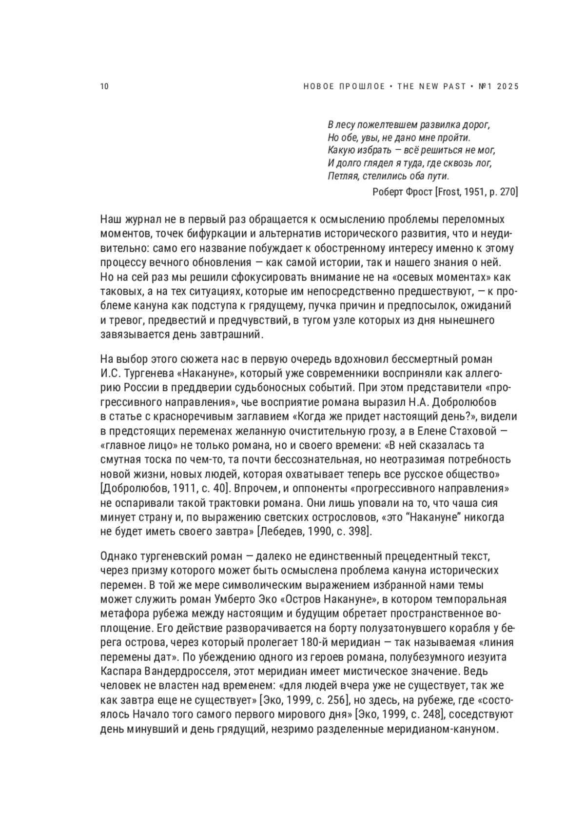 Наш журнал не в первый раз обращается к осмыслению проблемы переломных моментов, точек бифуркации и альтернатив исторического развития, что и неудивительно: само его название побуждает к обостренному интересу именно к этому процессу вечного обновления — как самой истории, так и нашего знания о ней. Но на сей раз мы решили сфокусировать внимание не на «осевых моментах» как таковых, а на тех ситуациях, которые им непосредственно предшествуют, — к проблеме кануна как подступа к грядущему, пучка причин и предпосылок, ожиданий и тревог, предвестий и предчувствий, в тугом узле которых из дня нынешнего завязывается день завтрашний