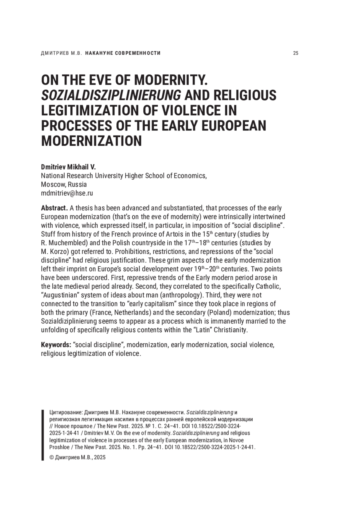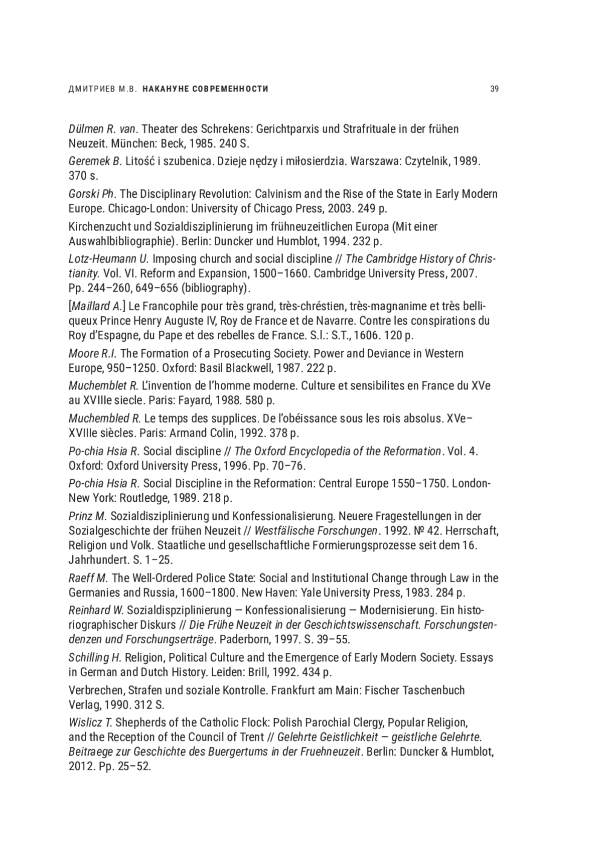 28. Dmitriev M.V. Ot hristianskoj antropologii vostochnoslavyanskih pravoslavnyh kultur XV-XVI vv. - k “provalu” socialnoj disciplinarizacii? [From Christian anthropology of the East Slavic orthodox cultures of the 15th-16th centuries - the failure of social discipline?], in Chinese Journal of Slavic Studies. 2022. Vol. 2. No. 2. Pp. 1-19 (in Russian).