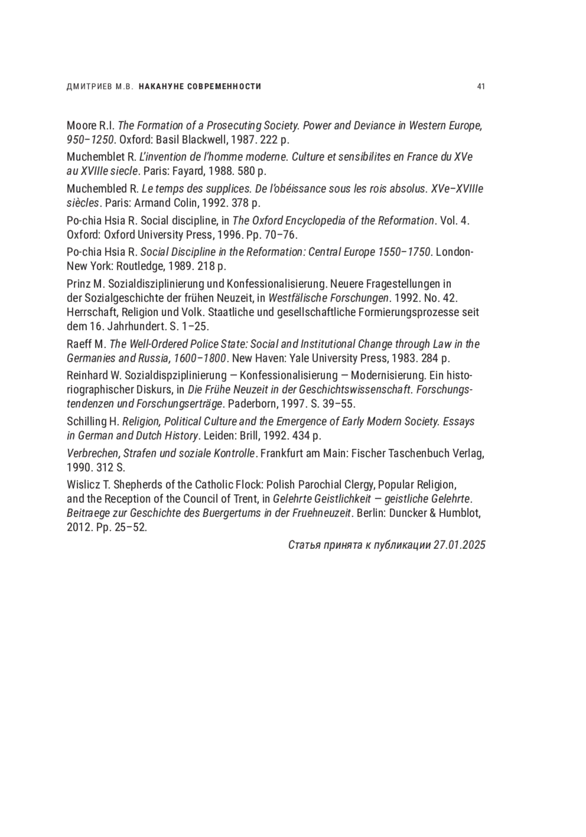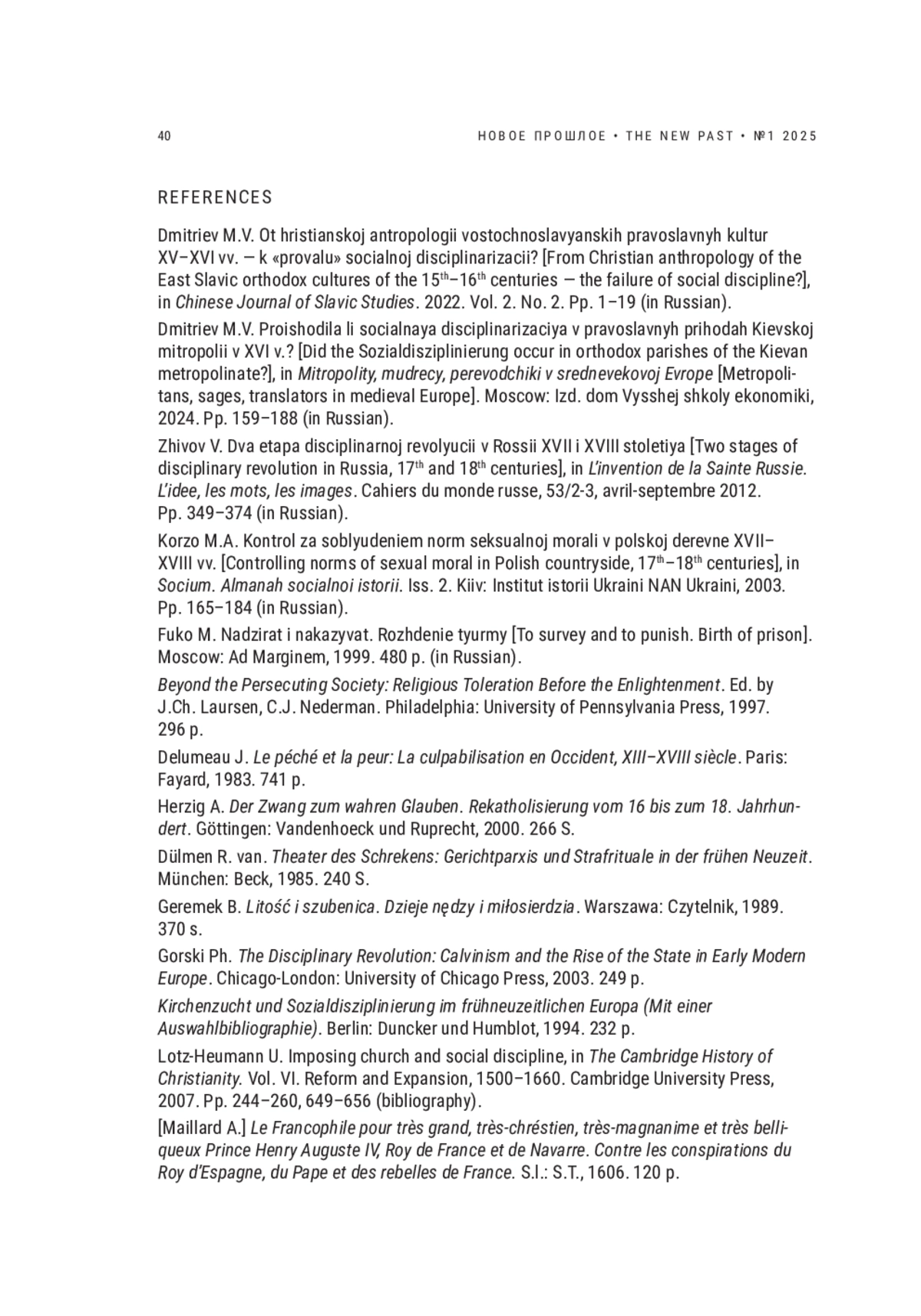 1. Дмитриев М.В. От христианской антропологии восточнославянских православных культур XV-XVI вв.-к “провалу” социальной дисциплинаризации? // Chinese Journal of Slavic Studies. 2022. Vol. 2. № 2. С. 1-19.