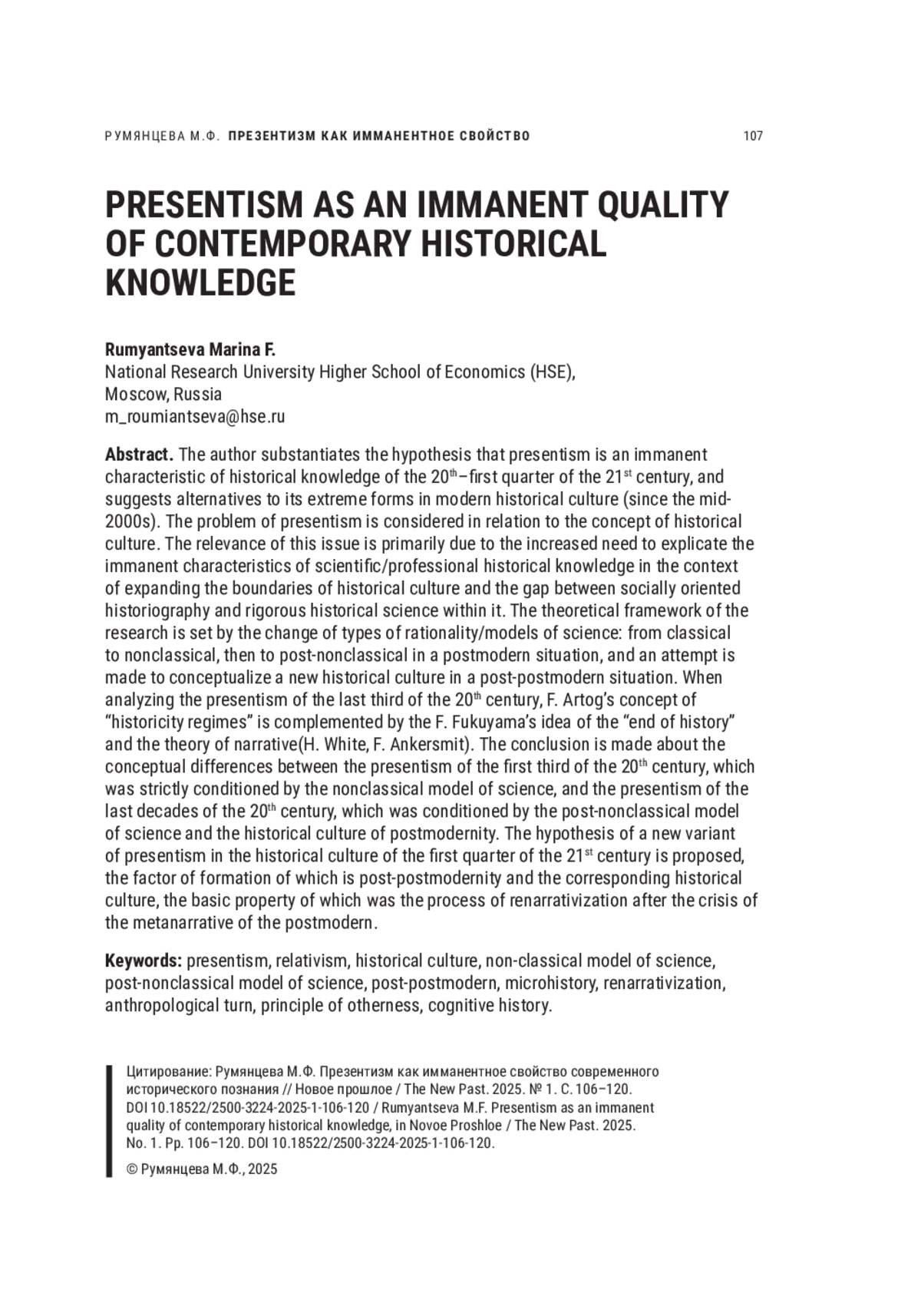 Обосновывается гипотеза о том, что презентизм является имманентной характеристикой исторического познания XX–первой четверти XXI в., а также предлагаются альтернативы его экстремальным формам в современной исторической культуре (с середины 2000-х гг.). Проблема презентизма рассматривается в соотнесении с концептом историческая культура. Актуальность данной проблематики обусловлена в первую очередь усилением необходимости экспликации имманентных характеристик научного/профессионального исторического познания в условиях расширения границ исторической культуры и разрыва внутри нее социально ориентированного историописания и истории как строгой науки. Теоретическую рамку исследования задает смена типов рациональности/моделей науки: от классической к неклассической, затем к постнеклассической в ситуации постмодерна, — и предпринимается попытка концептуализации новой исторической культуры в ситуации постпостмодерна. При анализе презентизма последней трети XX в. концепция «режимов историчности» Ф. Артога дополняется идеей «конца истории» Ф. Фукуямы и теорией нарратива (Х. Уайт, Ф. Анкерсмит). Сделан вывод о концептуальных различиях презентизма первой трети XX в., жестко обусловленного становлением неклассической модели науки, и презентизма последних десятилетий XX в., обусловленного постнеклассической моделью науки и исторической культурой постмодерна. Предлагается гипотеза нового варианта презентизма в исторической культуре первой четверти XXI в., фактором формирования которого является постпостмодерн и соответствующая ему историческая культура, базовым свойством которой стал процесс ренарративизации после кризиса метанарратива эпохи постмодерна