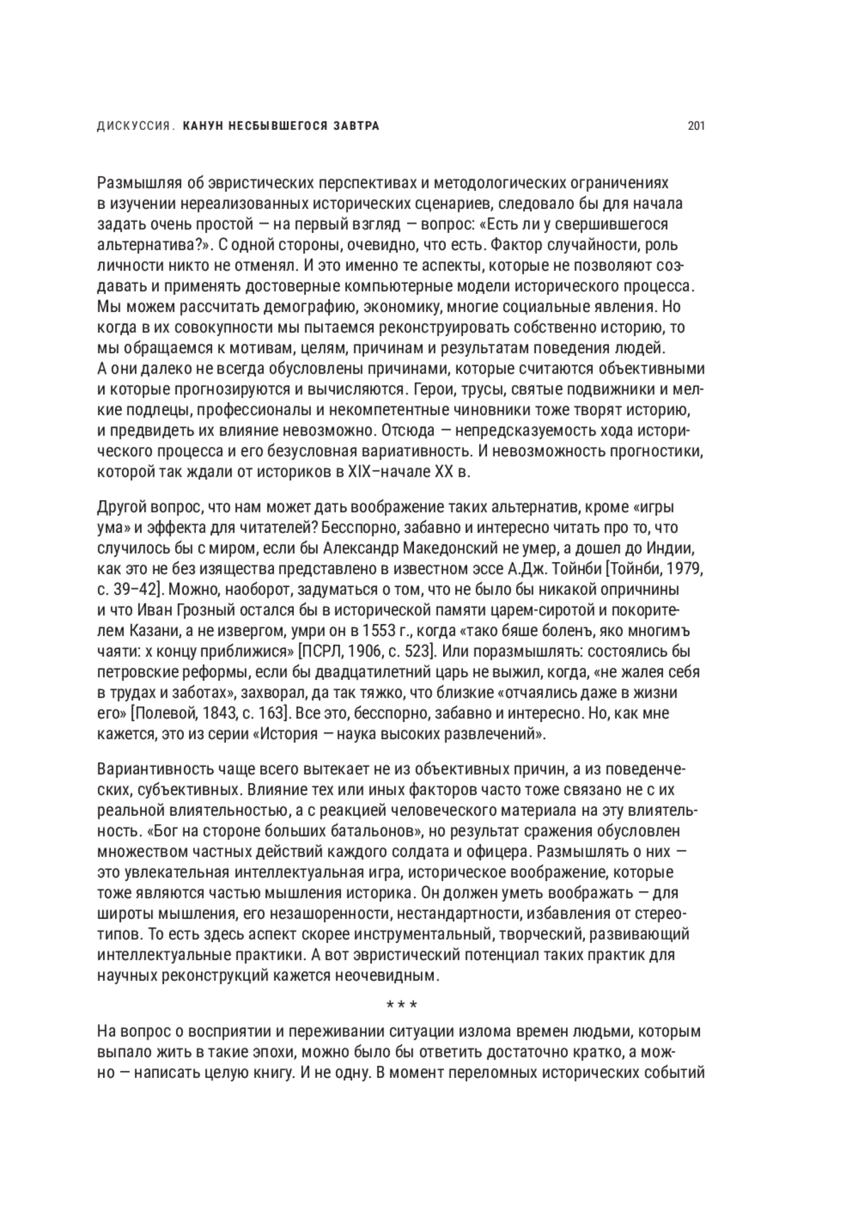 Проблема гипотетических рассуждений об альтернативности прошлого и необходимости изучения образов будущего в прошлом рассматривается сквозь призму теории современных социогуманитарных наук. Отмечается важность факторов непредвиденного в жизни людей и законность профессионального интереса историка как к мотивам исторических акторов, так и к альтернативным реконструкциям прошлого, вызывающим дискуссии о закономерности тех или иных явлений прошлого. Отмечается роль Р. Козеллека, привнесшего в историографию феноменологическую трактовку исторического времени как смены «теперь» — цепи событий, связанных «пространством опыта» и «горизонтами ожидания» живущих поколений, подчеркивается также значимость его представлений о рекурсивной связи «слоев времени», вбирающих в себя и жизнь человека, и бытование длительно существующих социальных структур. Тема проживания исторических канунов современниками представлена в логике рассуждения о темпоральных дискурсах. Историк имеет свободу выбора: уделять ему внимание «подводным течениям» коллективного бессознательного или посвятить себя постфактуальному моделированию, руководствуясь непреложным знанием исходов. Историю победителей и побежденных следует, по мнению автора, писать с позиций симметричного их представления, с обозначением всех значимых контекстуальных нюансов их существования, а историю утопических дискурсов — с позиций того, что разделяемые массой людей убеждения сами становятся влиятельным фактором формирования будущего, даже если грядущее сформируется отличным от ожидаемого образом