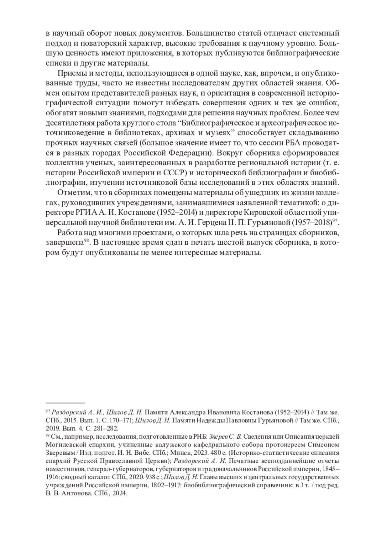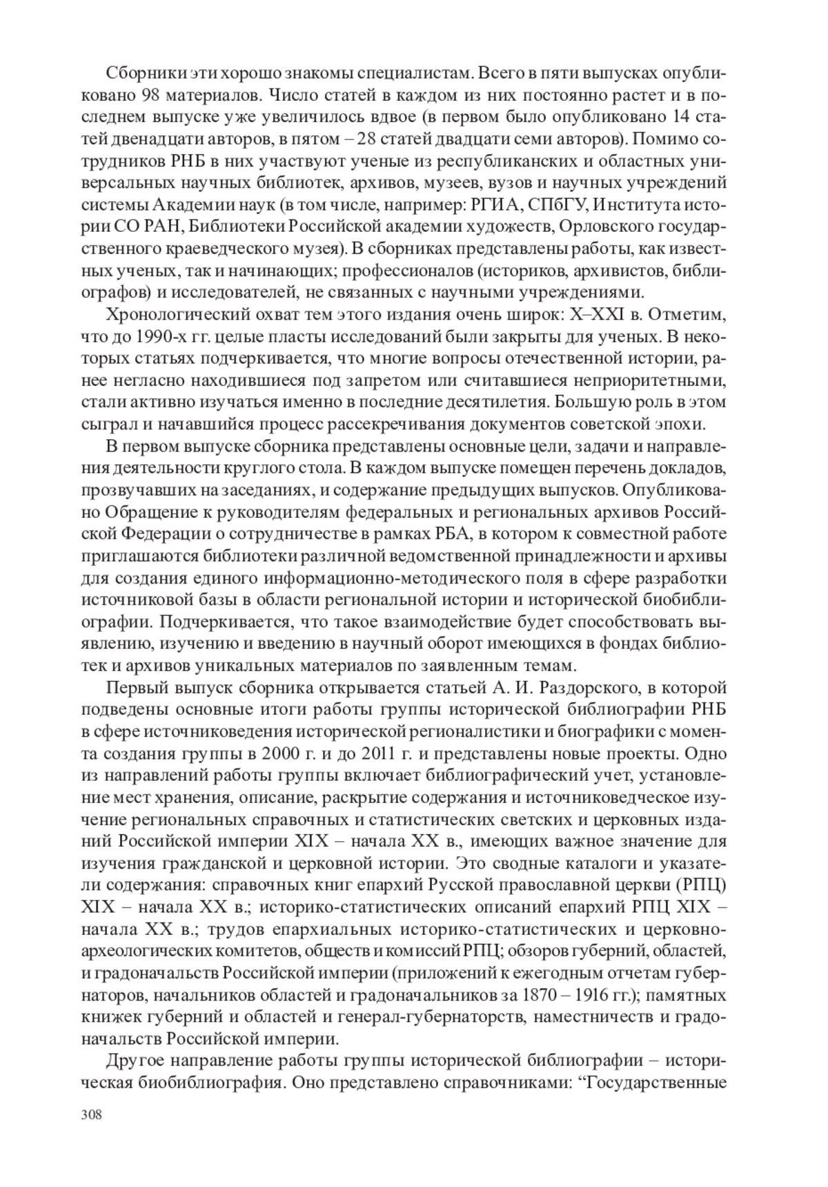 7. Раздорский А. И. Основные итоги и перспективы работы группы исторической библиографии РНБ в сфере источниковедения исторической регионалистики и биографики в 2000-2011 гг. // Библиография. Археография. Источниковедение: сб. ст. и материалов / ред.-сост. А. И. Раздорский, Д. Н. Шилов. СПб., М., 2012. Вып. 1. С. 5-28. EDN: VOZCBB