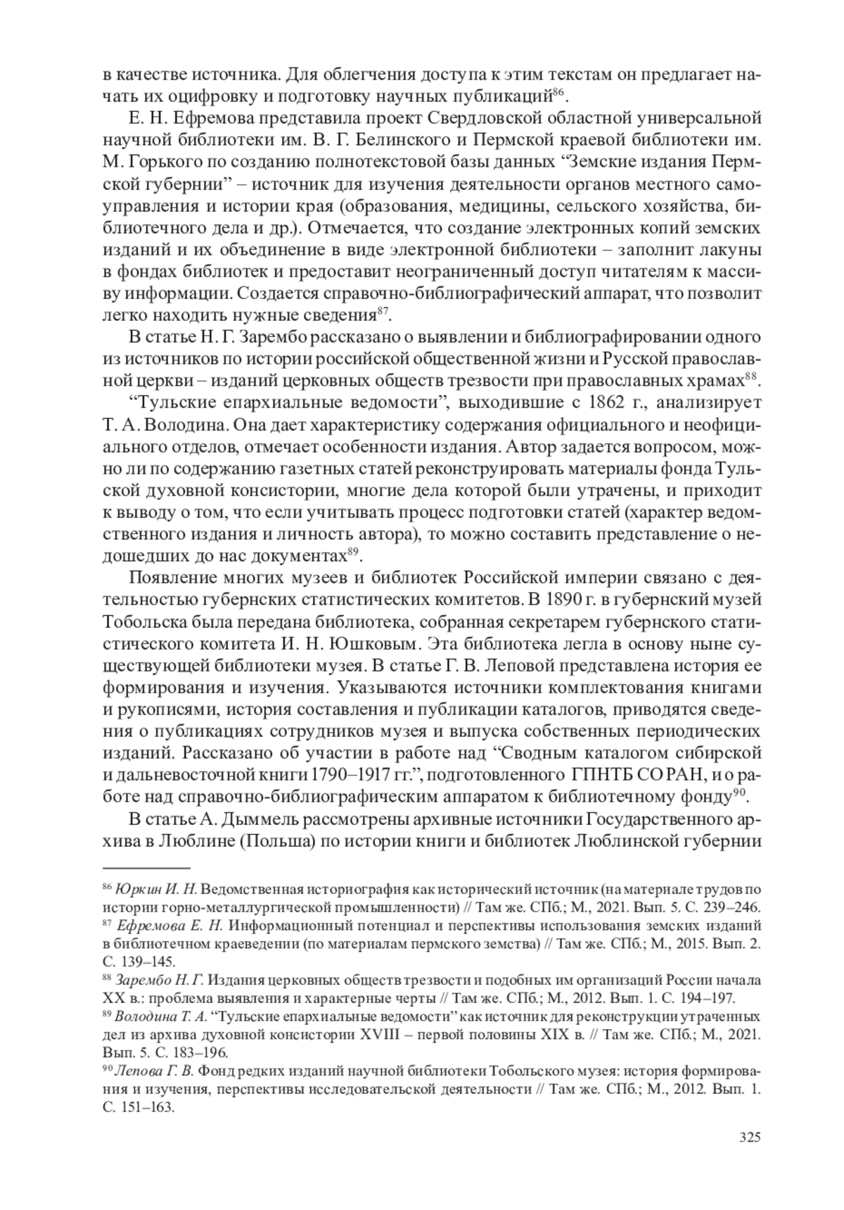 92. Володина Т. А. “Тульские епархиальные ведомости” как источник для реконструкции утраченных дел из архива духовной консистории XVIII - первой половины XIX в. // Библиография. Археография. Источниковедение: сб. ст. и материалов / ред.-сост. А. И. Раздорский, Д. Н. Шилов. СПб., М., 2021. Вып. 5. С. 183-196.