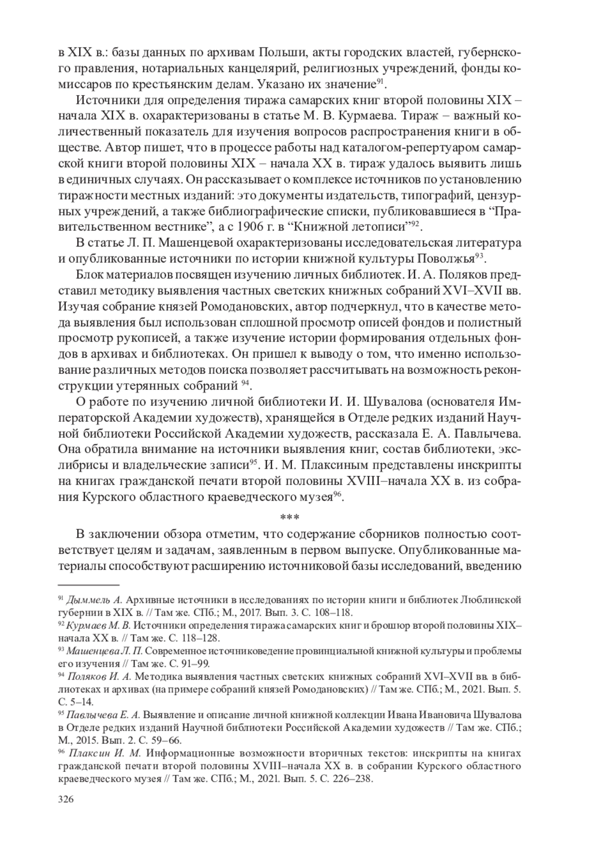 97. Поляков И. А. Методика выявления частных светских книжных собраний XVI-XVII вв. в библиотеках и архивах (на примере собраний князей Ромодановских) // Библиография. Археография. Источниковедение: сб. ст. и материалов / ред.-сост. А. И. Раздорский, Д. Н. Шилов. СПб., М., 2022. Вып. 5. С. 5-14.