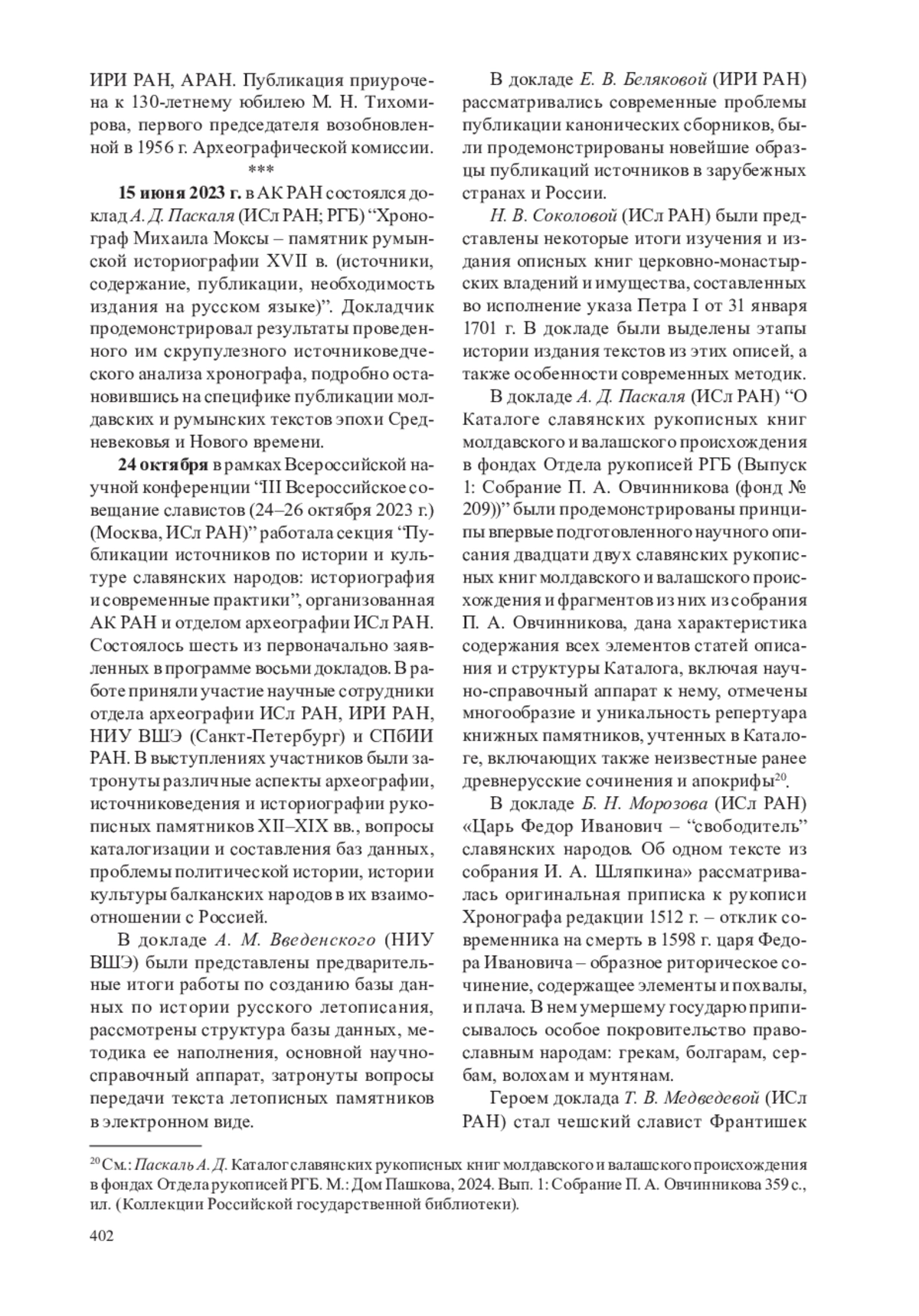 10. Туманик Е. Н. Состоялось Всероссийское совещание Археографической комиссии РАН // Гуманитарные науки в Сибири. 2019. Т. 26. № 3. С. 110-111. EDN: PWMOSV