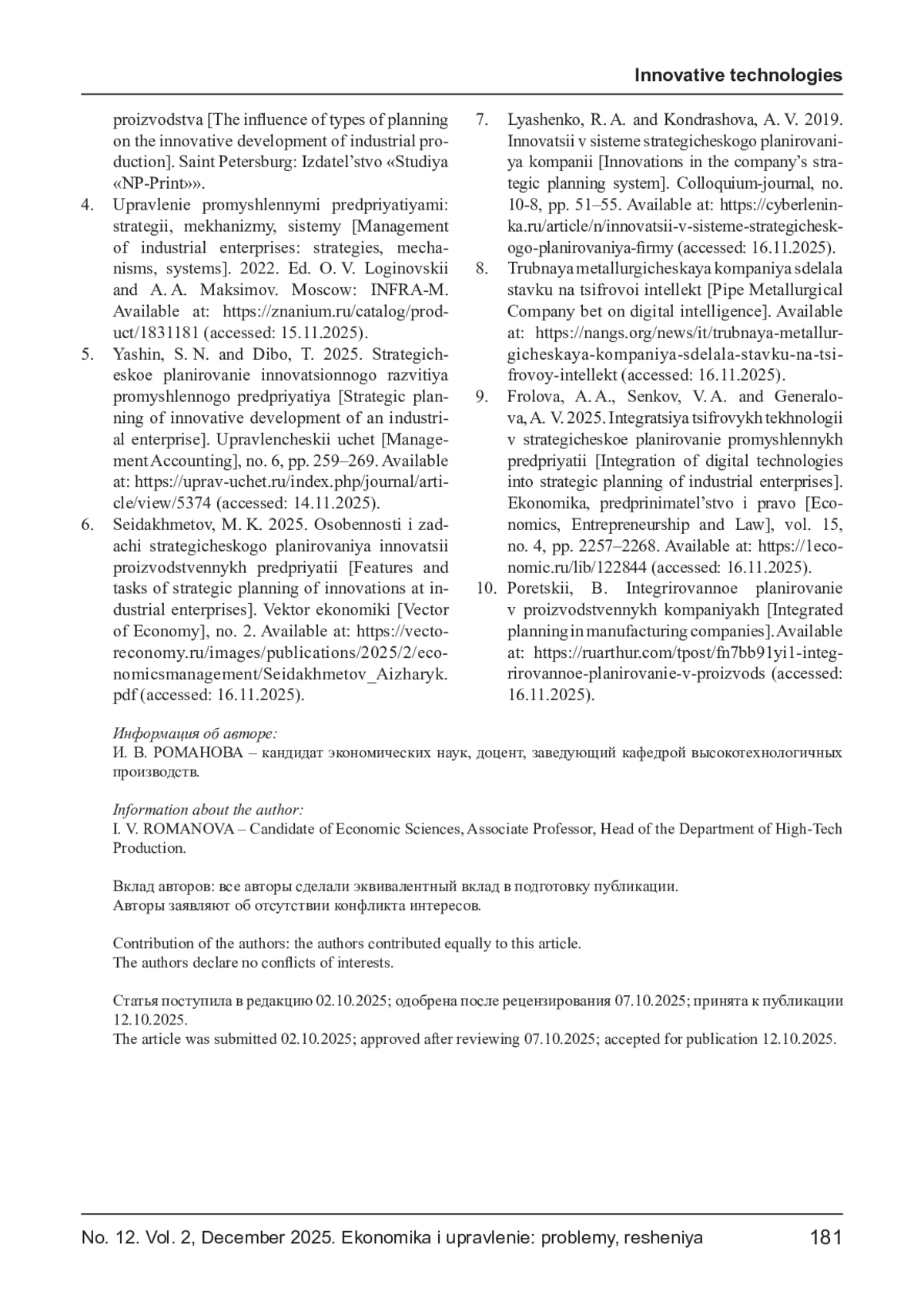 6. Сейдахметов М. К. Особенности и задачи стратегического планирования инноваций производственных предприятий // Вектор экономики. - 2025. - № 2. - URL: https://vectoreconomy.ru/images/publications/2025/2/economicsmanagement/Seidakhmetov_Aizharyk.pdf.