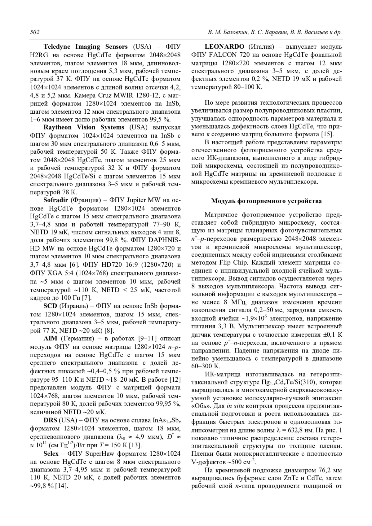 Базовкин В. М., Варавин В. С., Васильев В. В., Глухов А. В., Горшков Д. В., Дворецкий С. А., Ковчавцев А. П., Макаров Ю. С., Марин Д. В., Мжельский И. В., Половинкин В. Г., Ремесник В. Г., Сабинина И. В., Сидоров Ю. Г., Сидоров Г. Ю., Строганов А. С., Царенко А. В., Якушев М. В., Латышев А. В. Мегапиксельное матричное фотоприёмное устройство среднего ИК-диапазона 501