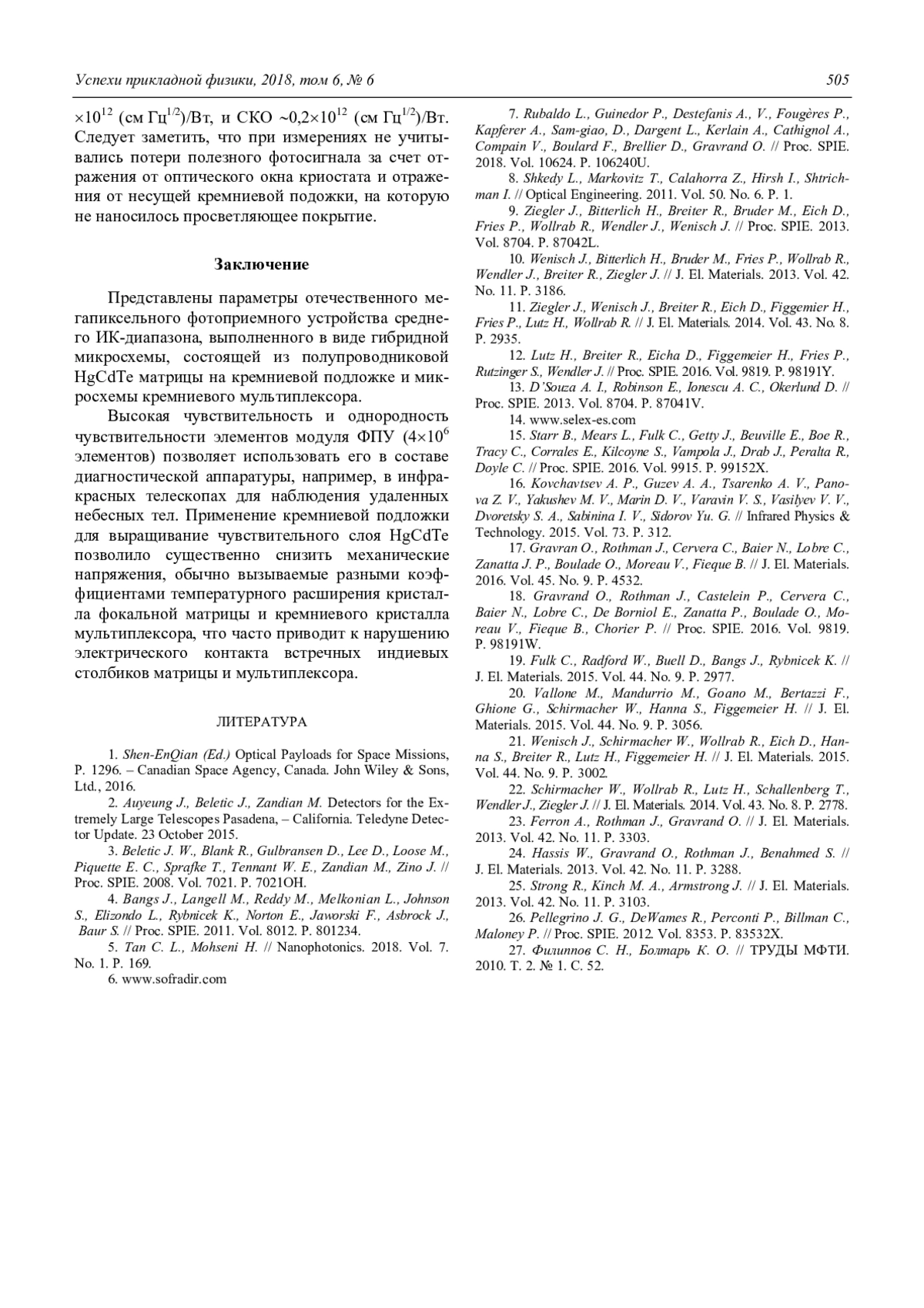 18. Gravrand O., Rothman J., Castelein P., Cervera C., Baier N., Lobre C., De Borniol E., Zanatta P., Boulade O., Moreau V., Fieque B., Chorier P. // Proc. SPIE. 2016. Vol. 9819. P. 98191W.