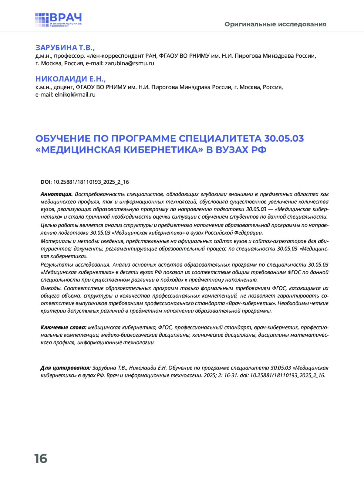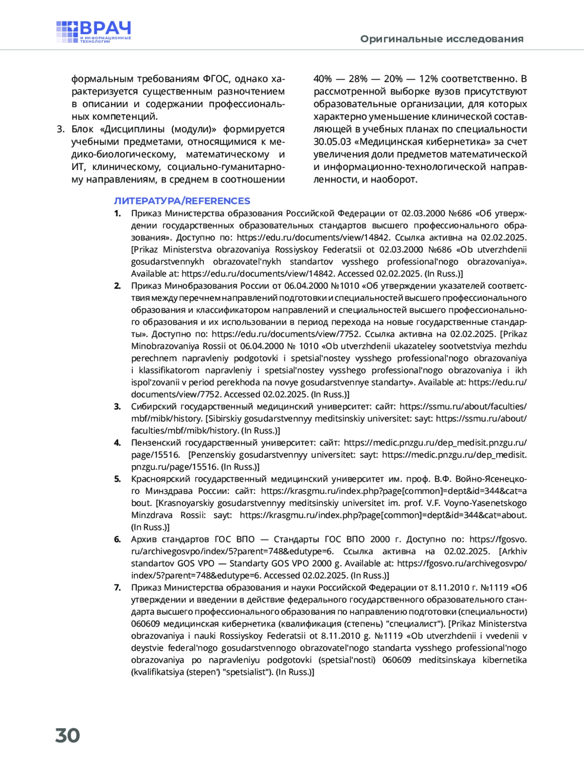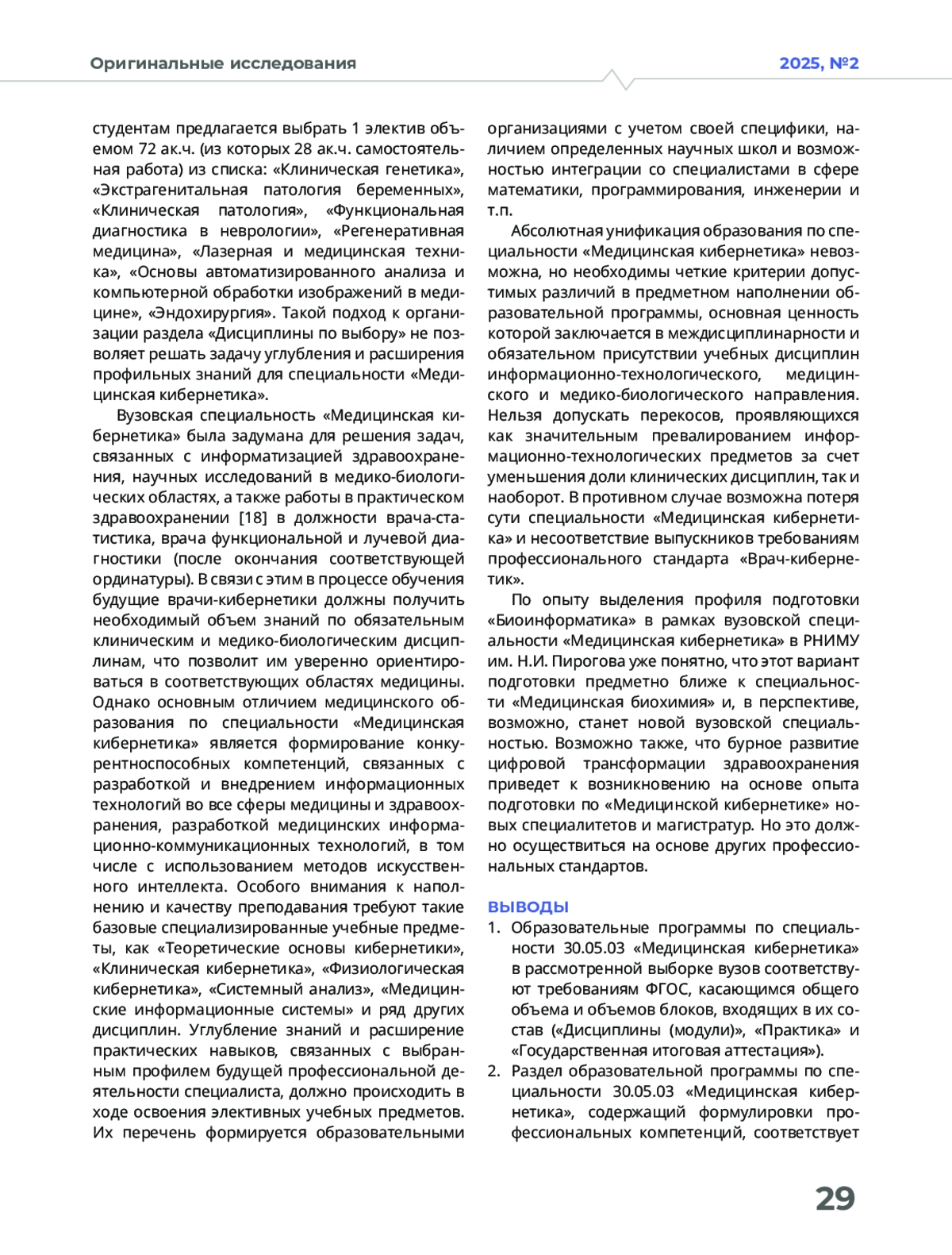 Результаты исследования. Анализ основных аспектов образовательных программ по специальности 30.05.03 «Медицинская кибернетика» в десяти вузах РФ показал их соответствие общим требованиям ФГОС по данной специальности при существенном различии в подходах к предметному наполнению.