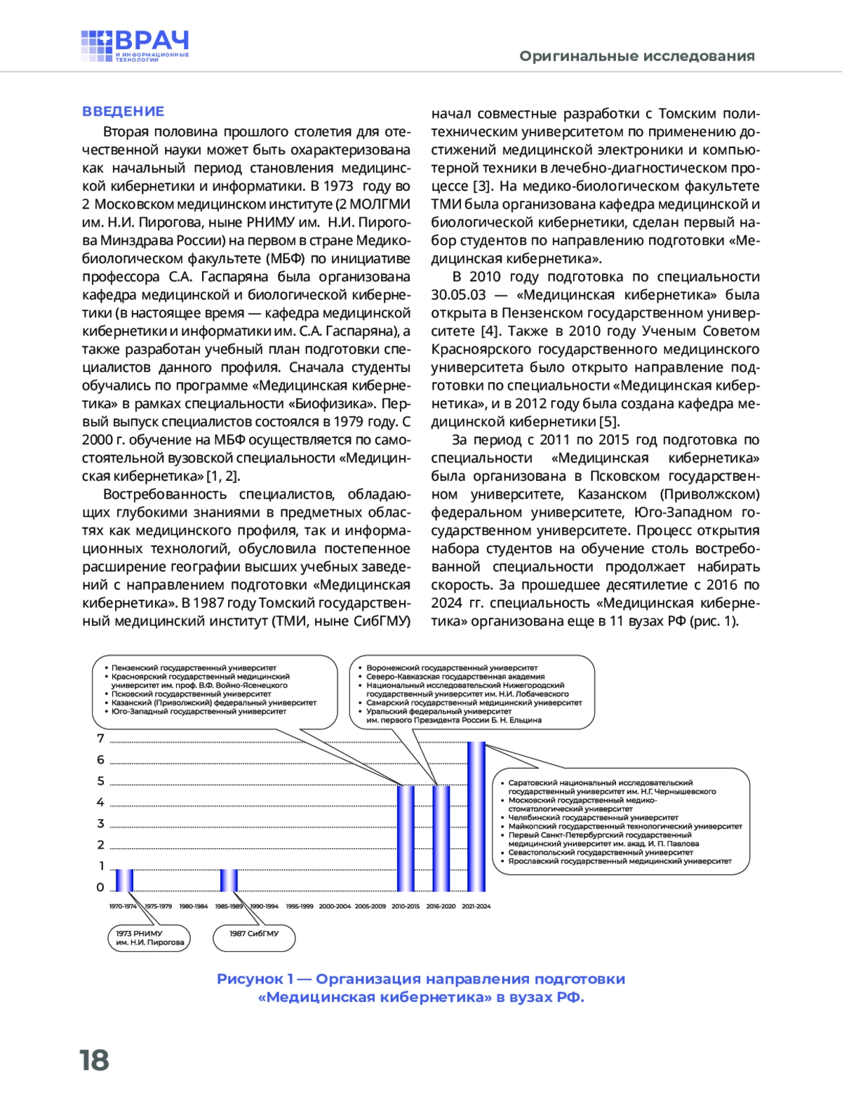 Вторая половина прошлого столетия для отечественной науки может быть охарактеризована как начальный период становления медицинской кибернетики и информатики. В 1973 году во 2 Московском медицинском институте (2 МОЛГМИ им. Н. И. Пирогова, ныне РНИМУ им. Н. И. Пирогова Минздрава России) на первом в стране Медикобиологическом факультете (МБФ) по инициативе профессора С. А. Гаспаряна была организована кафедра медицинской и биологической кибернетики (в настоящее время — кафедра медицинской кибернетики и информатики им. С. А. Гаспаряна), а также разработан учебный план подготовки специалистов данного профиля. Сначала студенты обучались по программе «Медицинская кибернетика» в рамках специальности «Биофизика». Первый выпуск специалистов состоялся в 1979 году. С 2000 г. обучение на МБФ осуществляется по самостоятельной вузовской специальности «Медицинская кибернетика» [1, 2].
