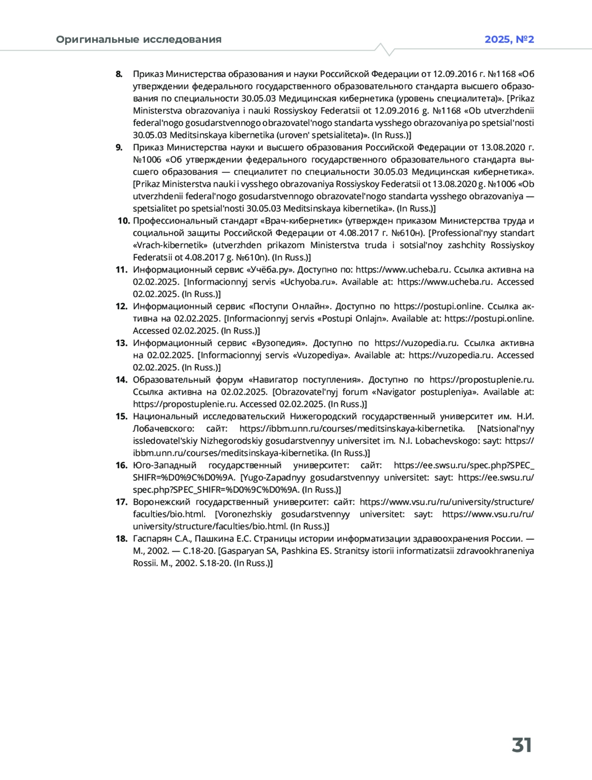 9. Приказ Министерства науки и высшего образования Российской Федерации от 13. 08. 2020 г. № 1006 “Об утверждении федерального государственного образовательного стандарта высшего образования - специалитет по специальности 30.05.03 Медицинская кибернетика”.