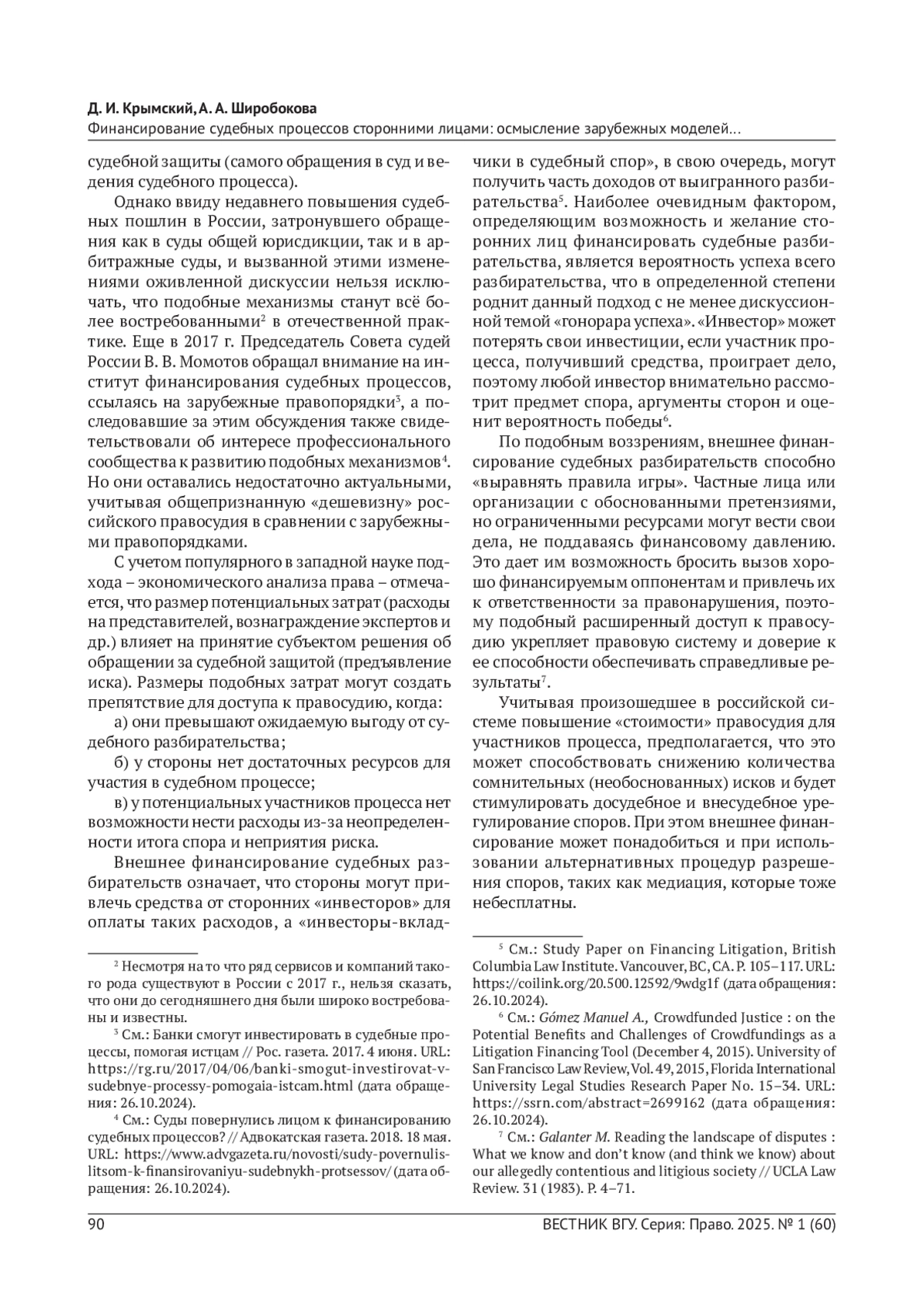 Однако ввиду недавнего повышения судебных пошлин в России, затронувшего обращения как в суды общей юрисдикции, так и в арбитражные суды, и вызванной этими изменениями оживленной дискуссии нельзя исключать, что подобные механизмы станут всё более востребованными2 в отечественной практике. Еще в 2017 г. Председатель Совета судей России В. В. Момотов обращал внимание на институт финансирования судебных процессов, ссылаясь на зарубежные правопорядки3, а последовавшие за этим обсуждения также свидетельствовали об интересе профессионального сообщества к развитию подобных механизмов4. Но они оставались недостаточно актуальными, учитывая общепризнанную «дешевизну» российского правосудия в сравнении с зарубежными правопорядками.
