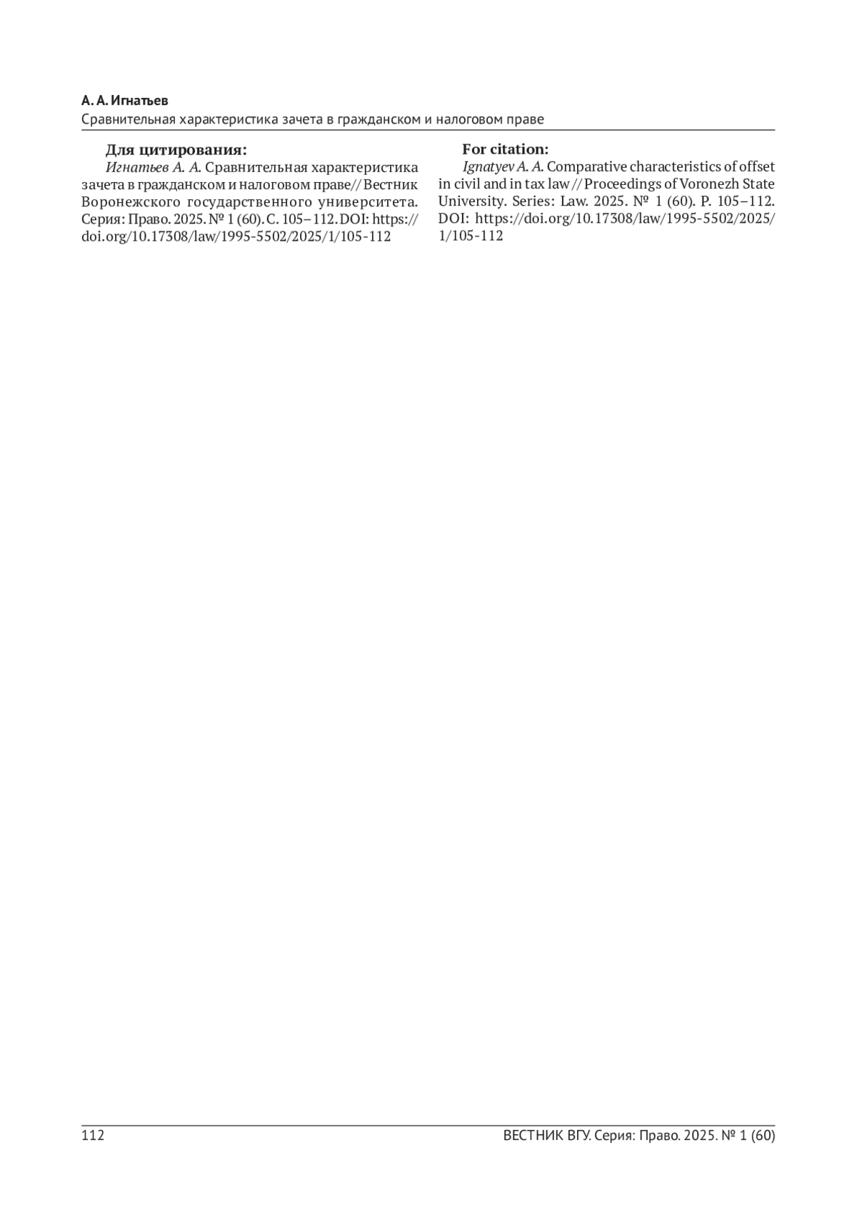 8. Рыженков А. Я. Зачет как юридический факт в гражданском праве // Власть Закона. 2021. № 3 (47). С. 59-70. EDN: URMYVG