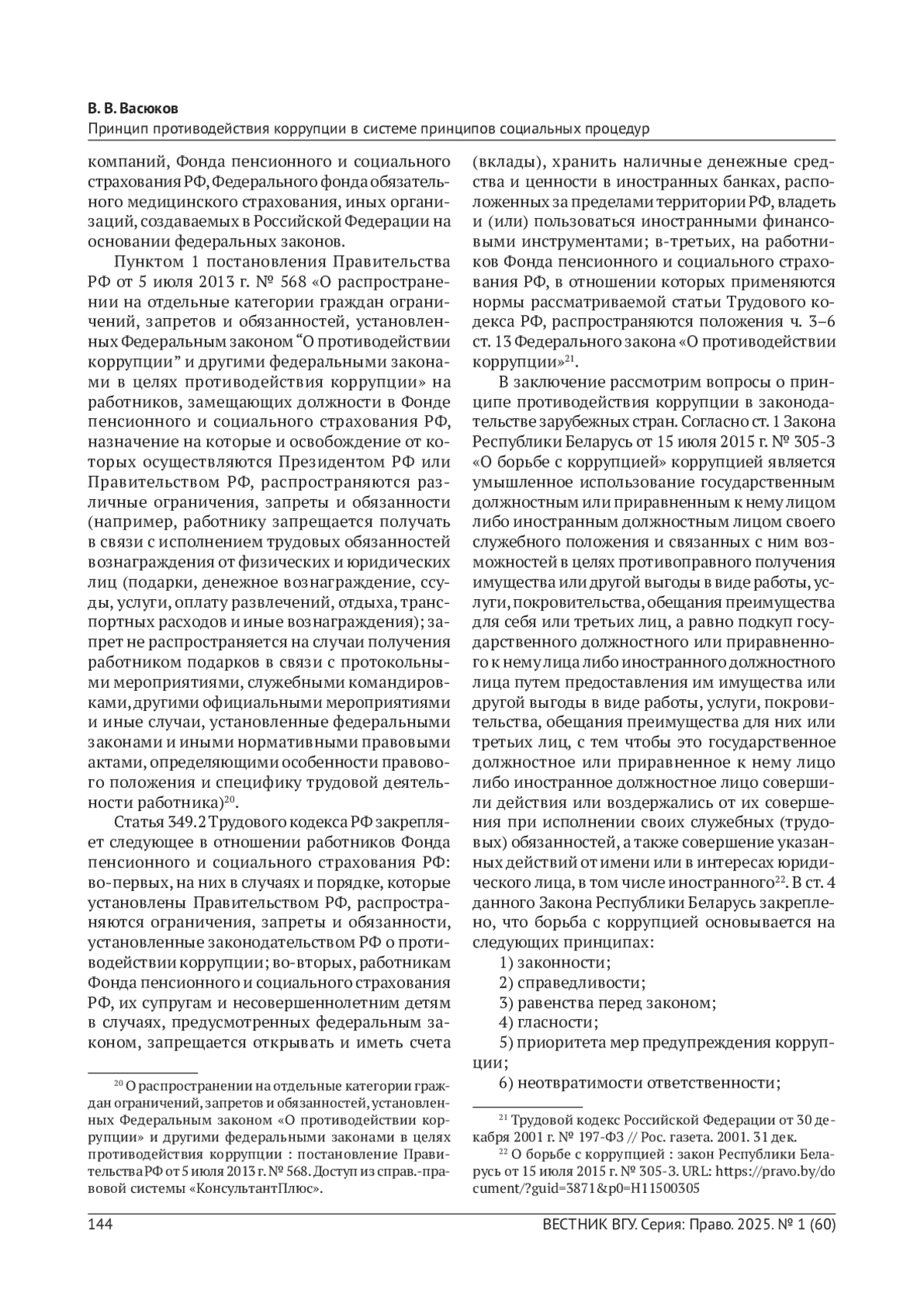 Коррупция - одна из главных проблем современного мира. Разные страны разработали антикоррупционное законодательство, исключением не является и Россия. В связи с этим различными учеными выделяется принцип противодействия коррупции, который в данной статье рассматривается в системе принципов социальных процедур. Исследовано российское законодательство по борьбе с коррупцией в сфере права социального обеспечения, затронуты нормы трудового права, касающиеся работников Фонда пенсионного и социального страхования РФ, рассмотрено законодательство Республики Беларусь и Республики Казахстан в сфере противодействия коррупции, сделан вывод о возможности использования норм зарубежного законодательства в российском праве, изучена правовая природа принципа противодействия коррупции на основании судебных актов Судебной коллегии по административным делам Верховного Суда РФ, Судебной коллегии по гражданским делам Верховного Суда РФ и трудов исследователей в сфере противодействия коррупции.