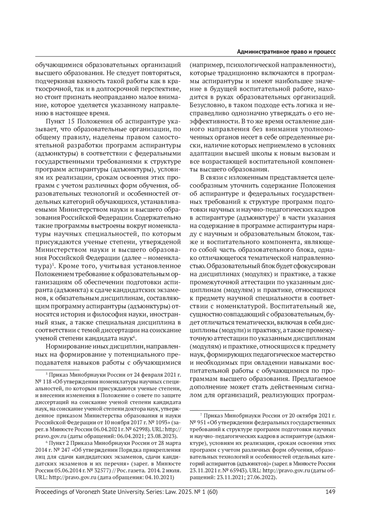 6. Приказ Минобрнауки России от 24 февраля 2021 г. № 118 “Об утверждении номенклатуры научных специальностей, по которым присуждаются ученые степени, и внесении изменения в Положение о совете по защите диссертаций на соискание ученой степени кандидата наук, на соискание ученой степени доктора наук, утвержденное приказом Министерства образования и науки Российской Федерации от 10 ноября 2017 г. № 1093” (зарег. в Минюсте России 06.04.2021 г. № 62998). URL: http://pravo.gov.ru (даты обращений: 06.04.2021; 23.08.2023).
