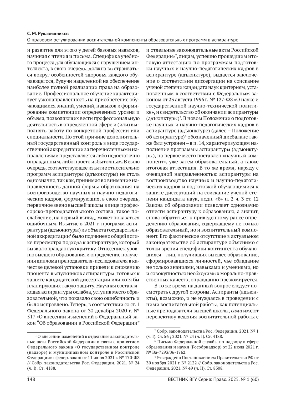 1. Приказ Минобрнауки России от 20 октября 2021 г. № 951 “Об утверждении федеральных государственных требований к структуре программ подготовки научных и научно-педагогических кадров в аспирантуре (адъюнктуре), условиям их реализации, срокам освоения этих программ с учетом различных форм обучения, образовательных технологий и особенностей отдельных категорий аспирантов (адъюнктов)” (зарег. в Минюсте России 23.11.2021 г. № 65943). URL: http://pravo.gov.ru (даты обращений: 23.11.2021; 27.06.2022).
