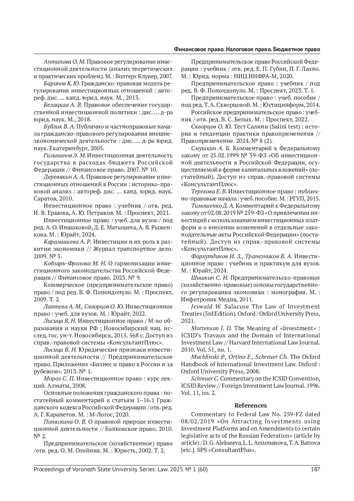 7. Деревякин А. А. Правовое регулирование инвестиционных отношений в России: историко-правовой анализ: автореф. дис.. канд. юрид. наук. Саратов, 2010. EDN: ZOAVSB