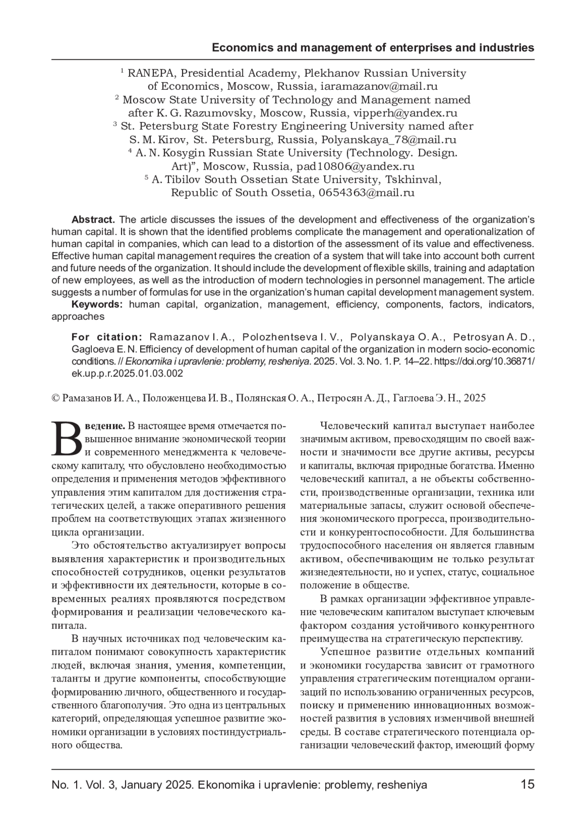 В статье рассмотрены вопросы развития и эффективности человеческого капитала организации. Показано, что наличие выявленных проблем затрудняет управление и операционализацию человеческого капитала в компаниях, что может привести к искажению оценки его стоимости и эффективности. Эффективное управление человеческим капиталом требует создания системы, которая будет учитывать как текущие, так и будущие потребности организации. Она должна включать в себя развитие гибких навыков, обучение и адаптацию новых сотрудников, а также внедрение современных технологий в управление персоналом. В статье предложен ряд формул для использования в системе управления развитием человеческого капитала организации.