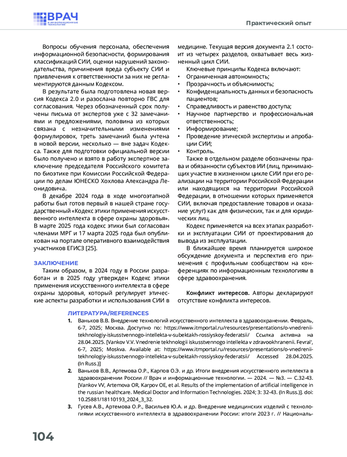 2. Ваньков В.В., Артемова О.Р., Карпов О.Э. и др. Итоги внедрения искусственного интеллекта в здравоохранении России // Врач и информационные технологии. - 2024. - № 3. - С. 32-43.. DOI: 10.25881/18110193_2024_3_32