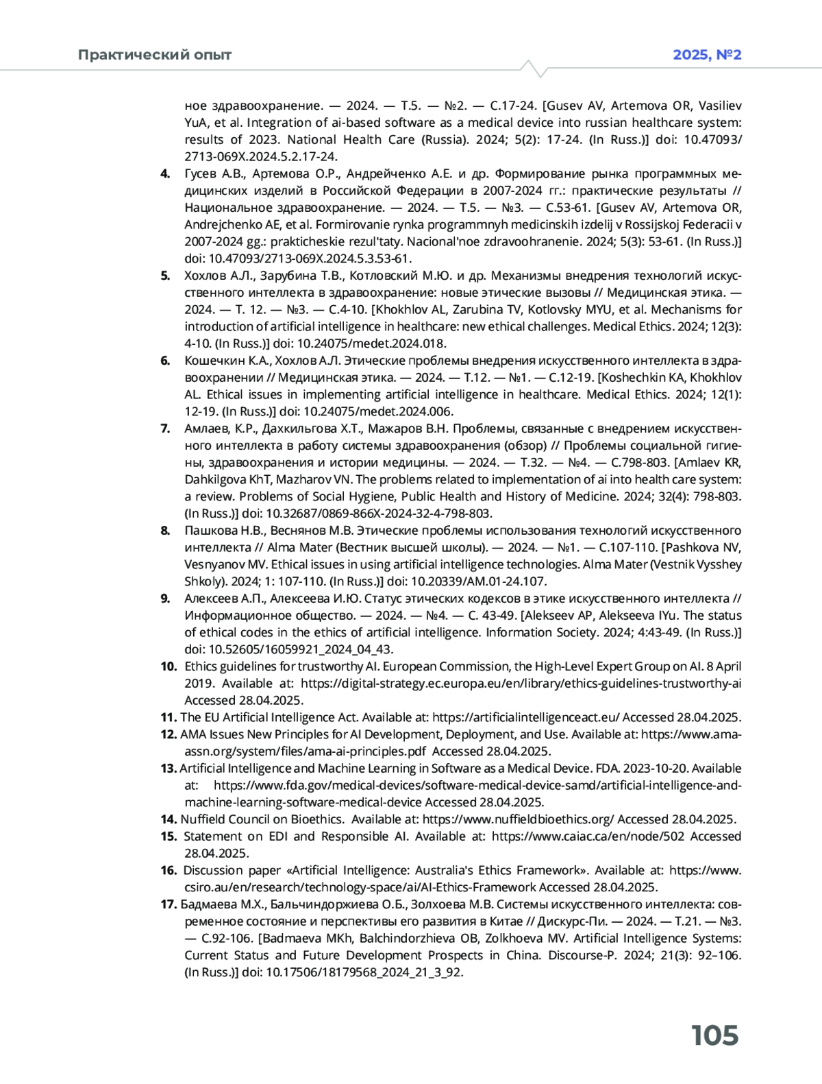 25. Кодекс этики применения искусственного интеллекта в сфере охраны здоровья // Портал оперативного взаимодействия участников ЕГИСЗ. Март, 2025. Доступно по: https://portal.egisz.rosminzdrav.ru/news/1001. Ссылка активна на 28. 04. 2025.