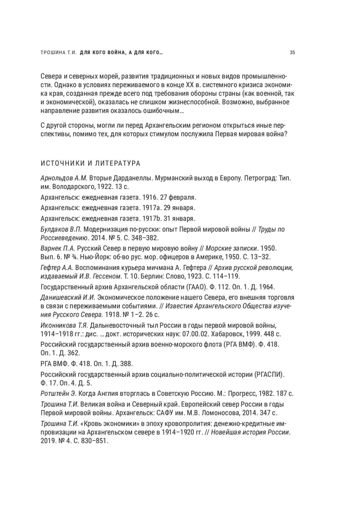 33. Troshina T.I. Velikaya vojna i Severnyj kraj. Evropejskij sever Rossii v gody Pervoj mirovoj vojny. [The Great War and the Northern Region. European North of Russia during the First World War]. Arhangel’sk: SAFU im. M.V. Lomonosova, 2014. 347 p. (in Russian).