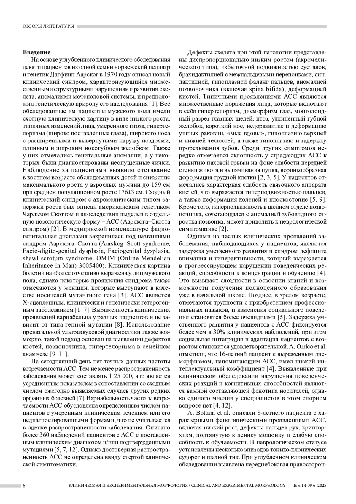 На основе углубленного клинического обследования девяти пациентов из одной семьи норвежский педиатр и генетик Дагфинн Аарског в 1970 году описал новый клинический синдром, характеризующийся множественными структурными нарушениями развития скелета, аномалиями мочеполовой системы, и предположил генетическую природу его наследования [1]. Все обследованные им пациенты мужского пола имели сходную клиническую картину в виде низкого роста, типичных изменений лица, умеренного птоза, гипертелоризма (широко поставленные глаза), широкого носа с расширенными и вывернутыми наружу ноздрями, длинным и широким носогубным желобком. Также у них отмечались генитальные аномалии, а у некоторых были диагностированы неопущенные яички. Наблюдение за пациентами выявило отставание в костном возрасте обследованных детей и снижение максимального роста у взрослых мужчин до 159 см при среднем популяционном росте 176±3 см. Сходный клинический синдром с акромелическим типом задержки роста был описан американским генетиком Чарльзом Скоттом и впоследствии выделен в отдельную нозологическую форму – АСС (Аарскога–Скотта синдром) [2]. В медицинской номенклатуре фациогенитальная дисплазия закрепилась под названиями синдром Аарскога–Скотта (Aarskog–Scott syndrome, Facio-digito-genital dysplasia, Faciogenital dysplasia, shawl scrotum syndrome, OMIM (Online Mendelian Inheritance in Man) 3005400). Клиническая картина болезни наиболее отчетливо выражена у лиц мужского пола, однако некоторые проявления синдрома также отмечаются у женщин, которые выступают в качестве носителей мутантного гена [3]. АСС является Х-сцепленным, клинически и генетически гетерогенным заболеванием [1–7]. Выраженность клинических проявлений вариабельна у разных пациентов и не зависит от типа генной мутации [8]. Использование пренатальной ультразвуковой диагностики также возможно, такой подход основан на выявлении дефектов костей, позвоночника, гипертелоризма в семейном анамнезе [9–11].