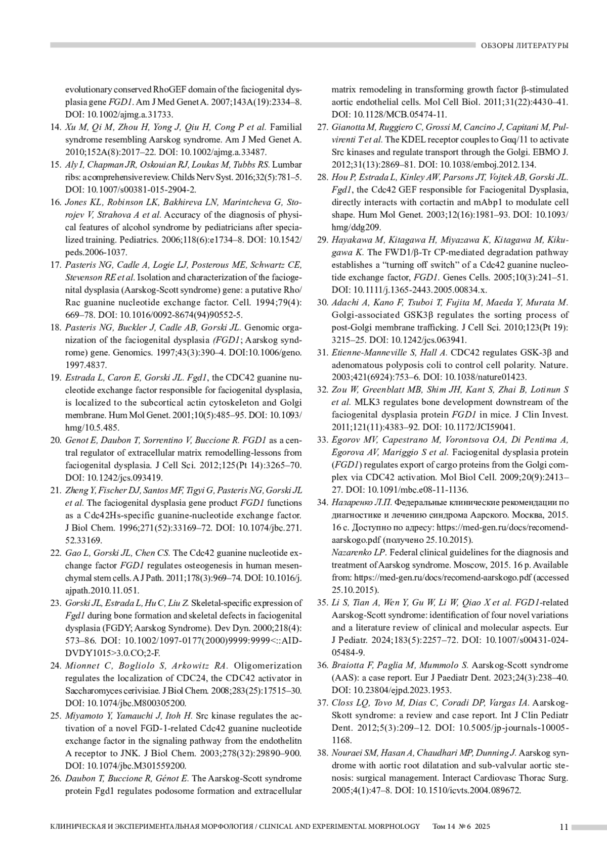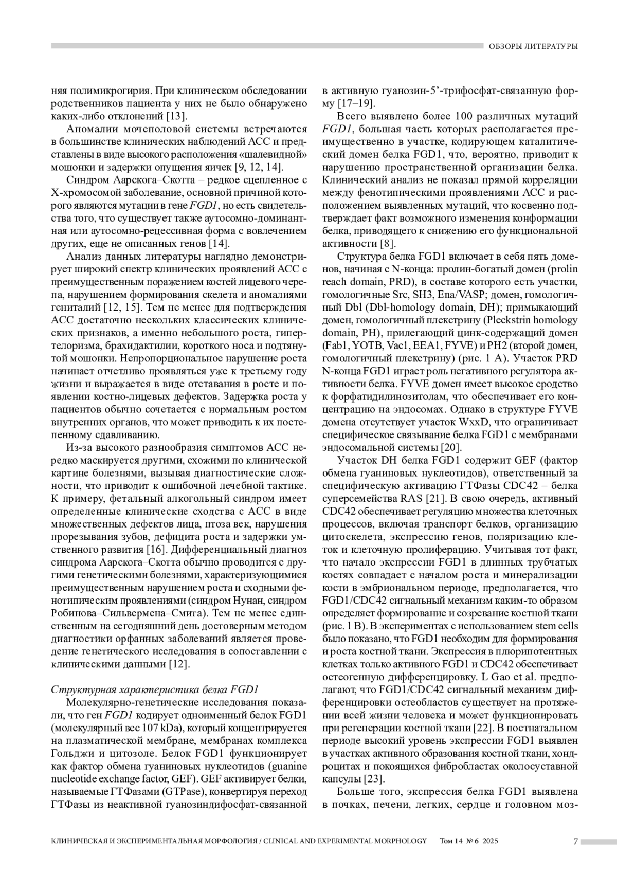 Синдром Аарскога–Скотта относится к группе редких генетических (орфанных) болезней, характеризующихся преимущественным поражением длинных трубчатых и плоских костей черепа. Проявления синдрома многообразны, среди них наиболее часто встречаются умеренная задержка роста, пороки развития урогенитальной системы, задержка умственного развития, множественные аномалии лицевого черепа. Причиной синдрома Аарскога–Скотта являются мутации гена FGD1, расположенного в Х-хромосоме, что определяет высокий риск развития патологии у лиц мужского пола. Ген FGD1 кодирует одноименный белок, который функционирует как фактор обмена гуаниновых нуклеотидов и служит специфическим активатором ГТФазы CDC42. Через свой основной эффектор CDC42 FGD1 регулирует множество клеточных процессов, включая экспрессию генов, клеточную дифференцировку, поляризацию клеток, транспорт белков и организацию внутриклеточного цитоскелета. Цель обзора – представить данные об этиологии, патогенезе, разнообразии клинических проявлений синдрома, предполагаемых механизмах патогенеза. Наряду с этим освещены важные аспекты, связанные с этой редкой генетической болезнью.